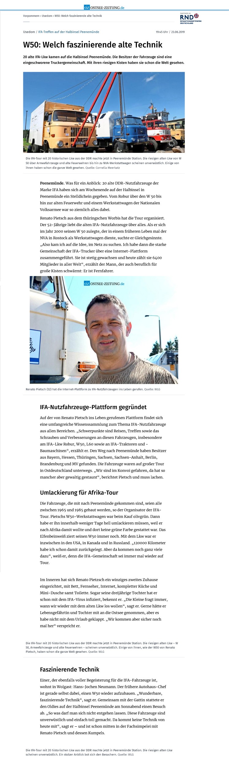 Auf der von Renato Pietsch ins Leben gerufenen Plattform findet sich eine umfangreiche Wissenssammlung zum Thema IFA-Nutzfahrzeuge aus allen Bereichen. „Schwerpunkte sind Reisen, Treffen sowie das Schrauben und Verbesserungen an diesen Fahrzeugen, insbesondere am IFA-Lkw Robur, W50, L60 sowie an IFA-Traktoren und -Baumaschinen“, erzählt er. Den Weg nach Peenemünde haben Besitzer aus Bayern, Hessen, Thüringen, Sachsen, Sachsen-Anhalt, Berlin, Brandenburg und MV gefunden. Die Fahrzeuge waren auf großer Tour in Ostdeutschland unterwegs. „Wir sind im Konvoi gefahren, da hat so mancher aber gewaltig gestaunt“, berichtet Pietsch und muss lachen.