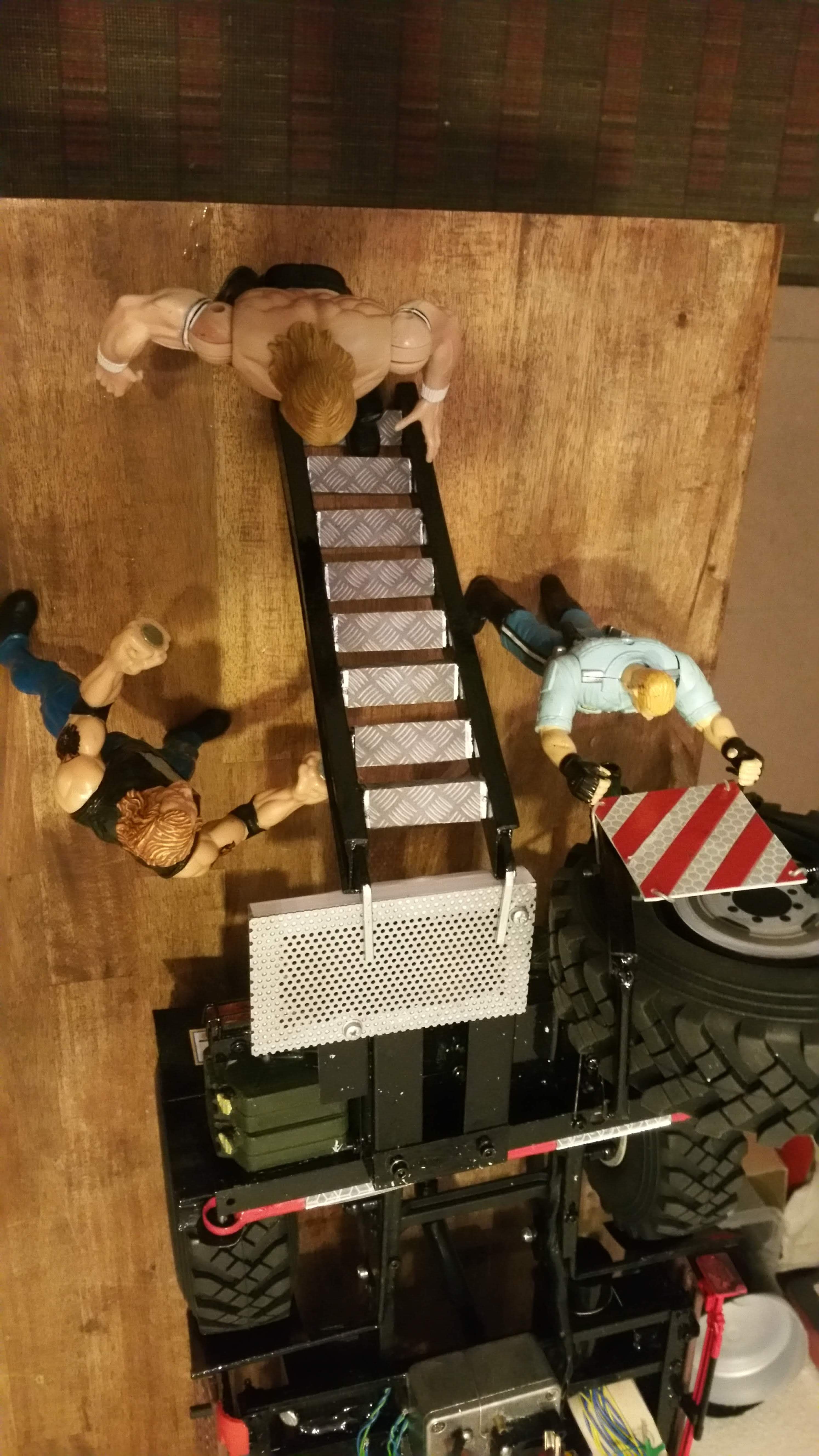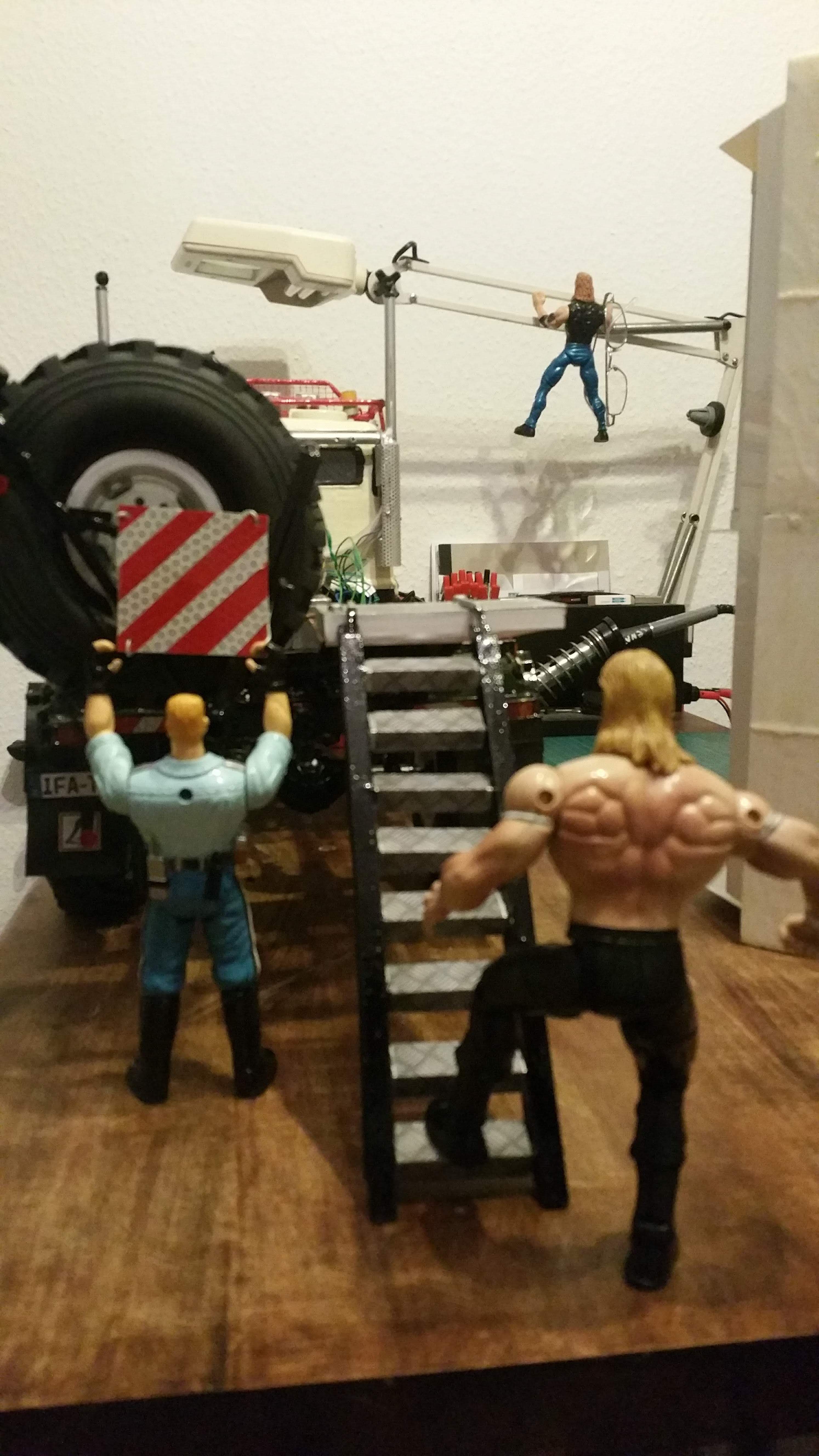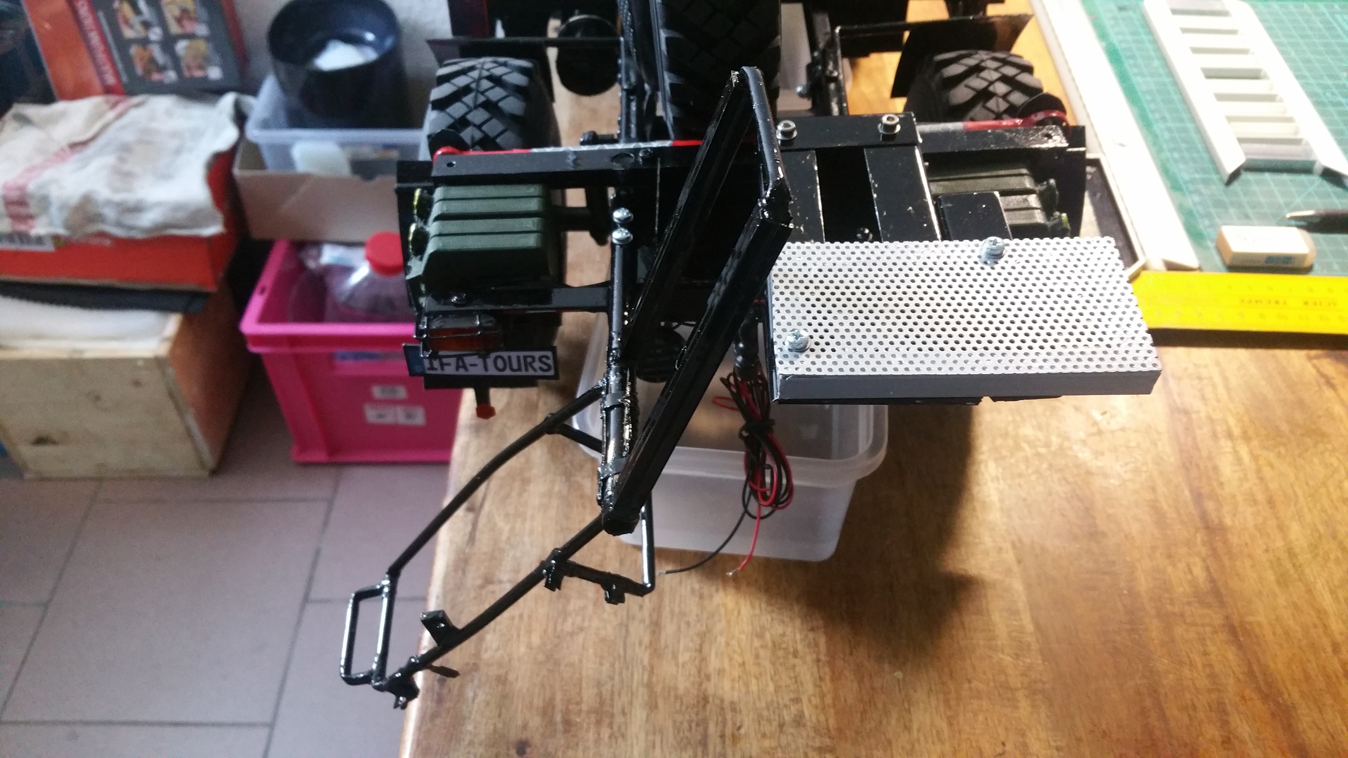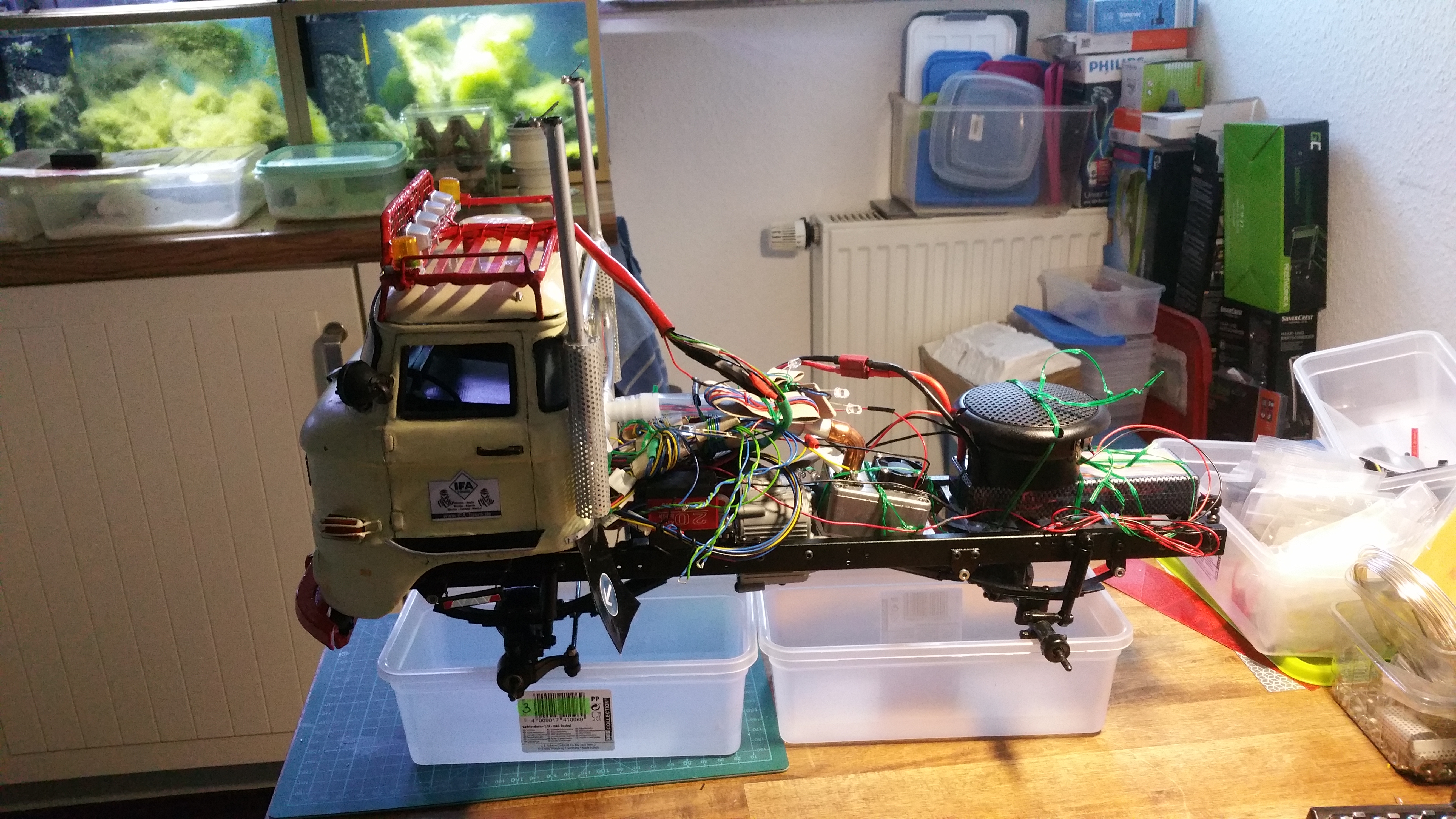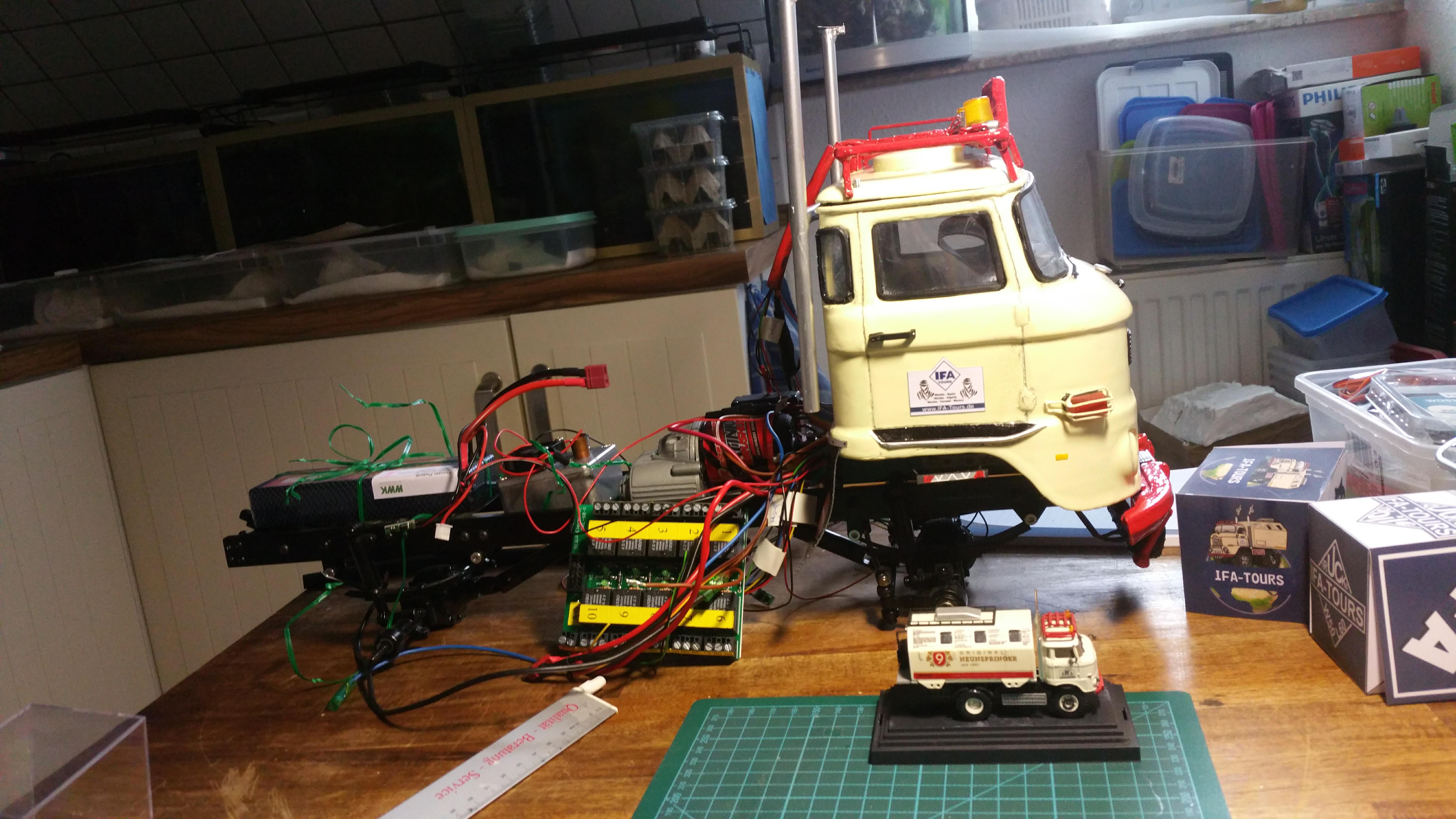 In der Woche wenn ich mit dem LKW unterwegs bin, arbeite ich dann an Baugruppen und Projekten, die dann am Wochenende am Modell komplettiert werden sollen. Im LKW habe ich bereits Dremel, Lötkolben, ein wenig Feinmechanikerwerkzeug usw. dabei.