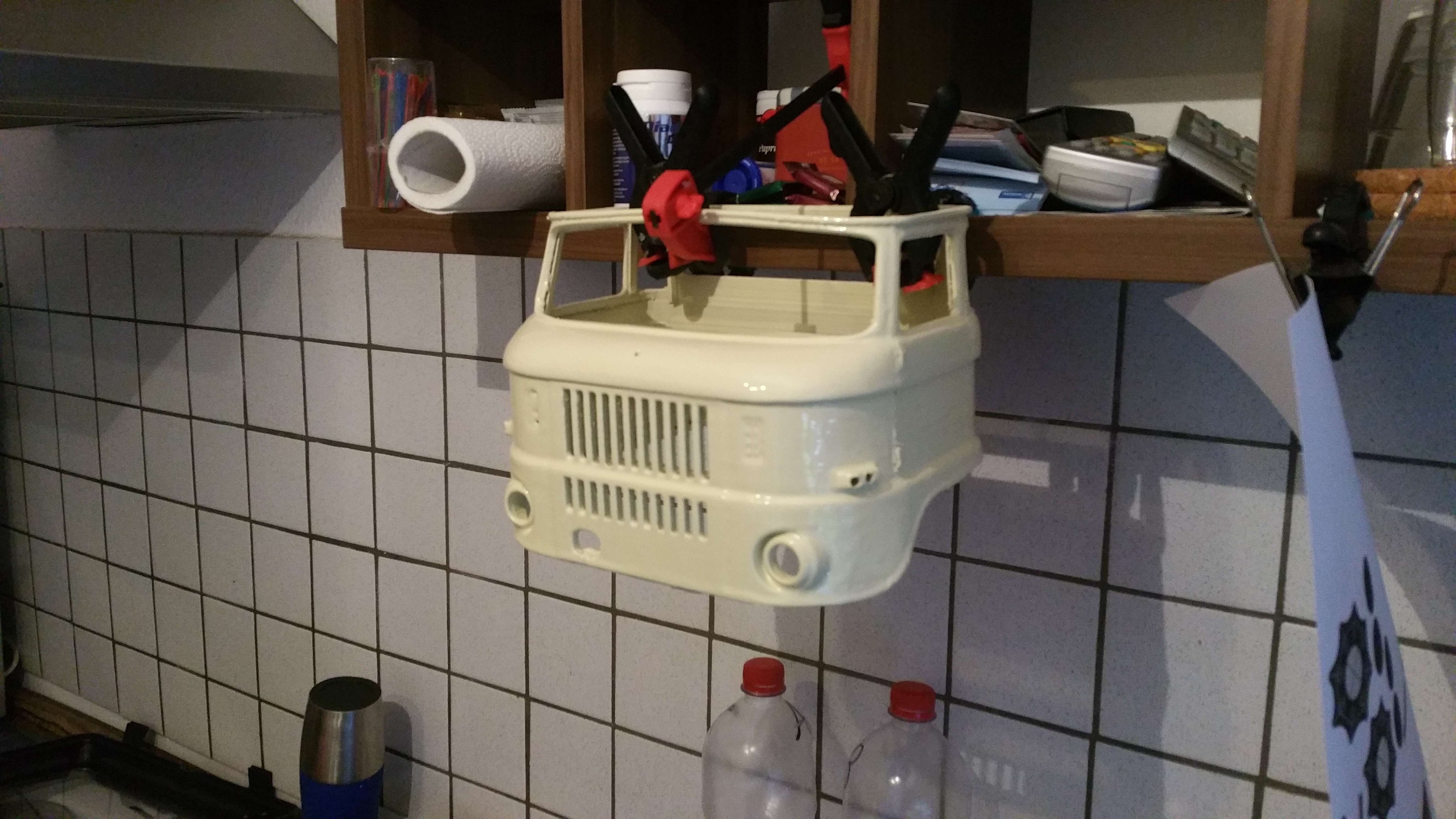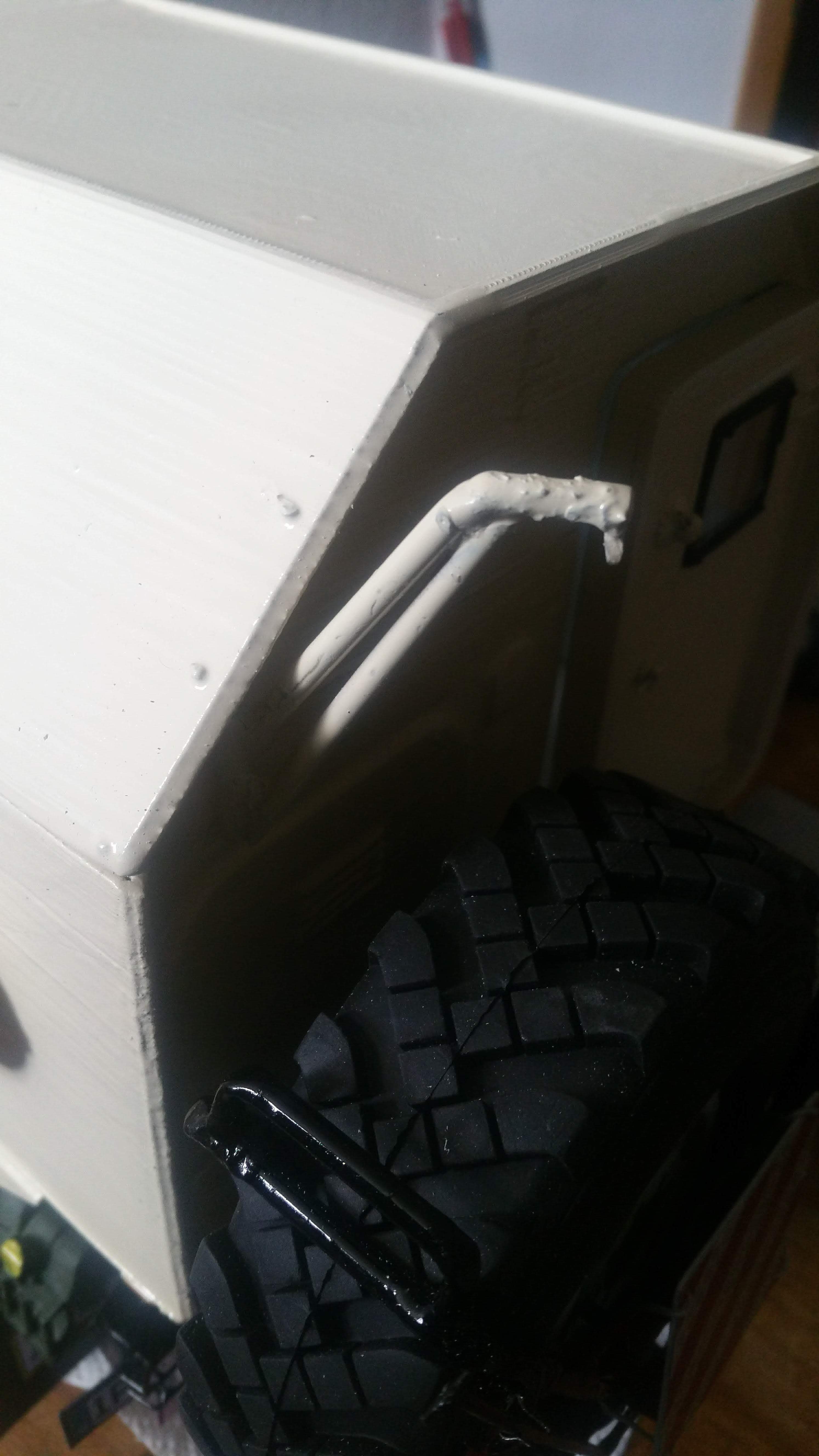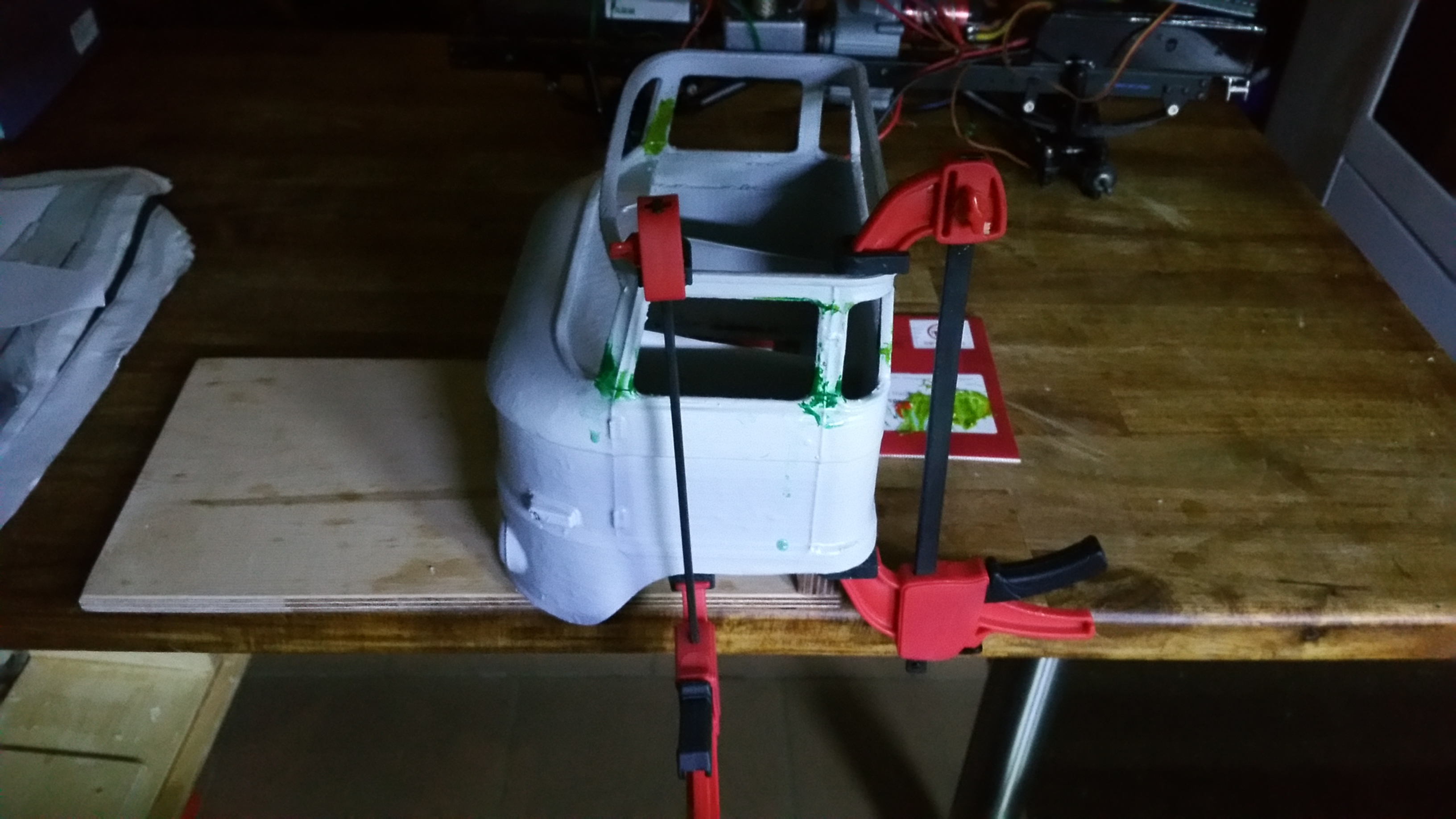 Durch ein kleines Missgeschick, ist mir das ganze Modell aus 1 Meter Höhe auf den Boden gestürzt und in viele Einzelteile zersprungen, besonders das Fahrerhaus. nach tagelanger Puzzelarbeit und Klebeorgien sieht es jetzt wieder einigermaßen nach Fahrerhaus aus. Ich habe es gleich noch mit der Spraydose lackiert.