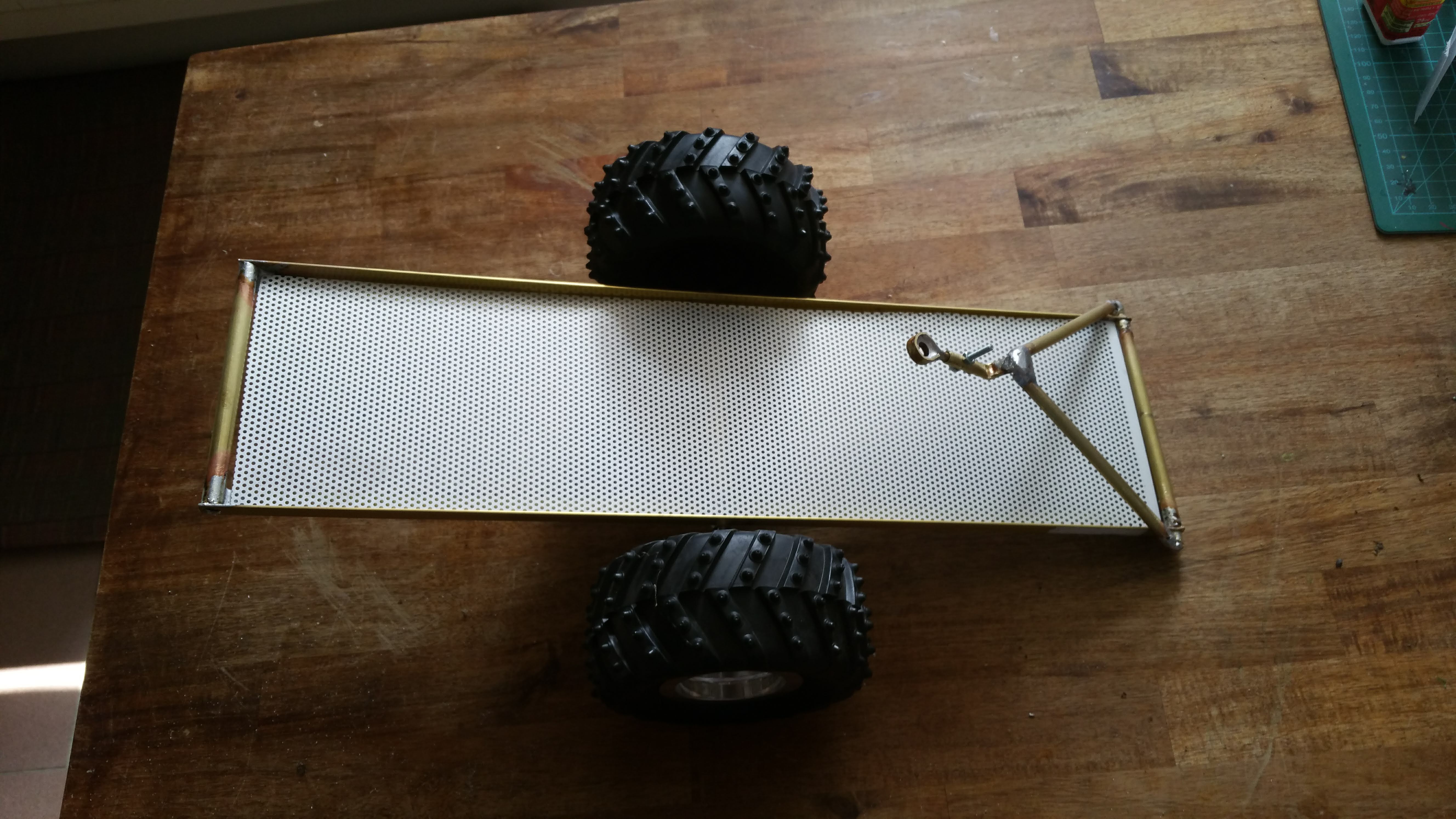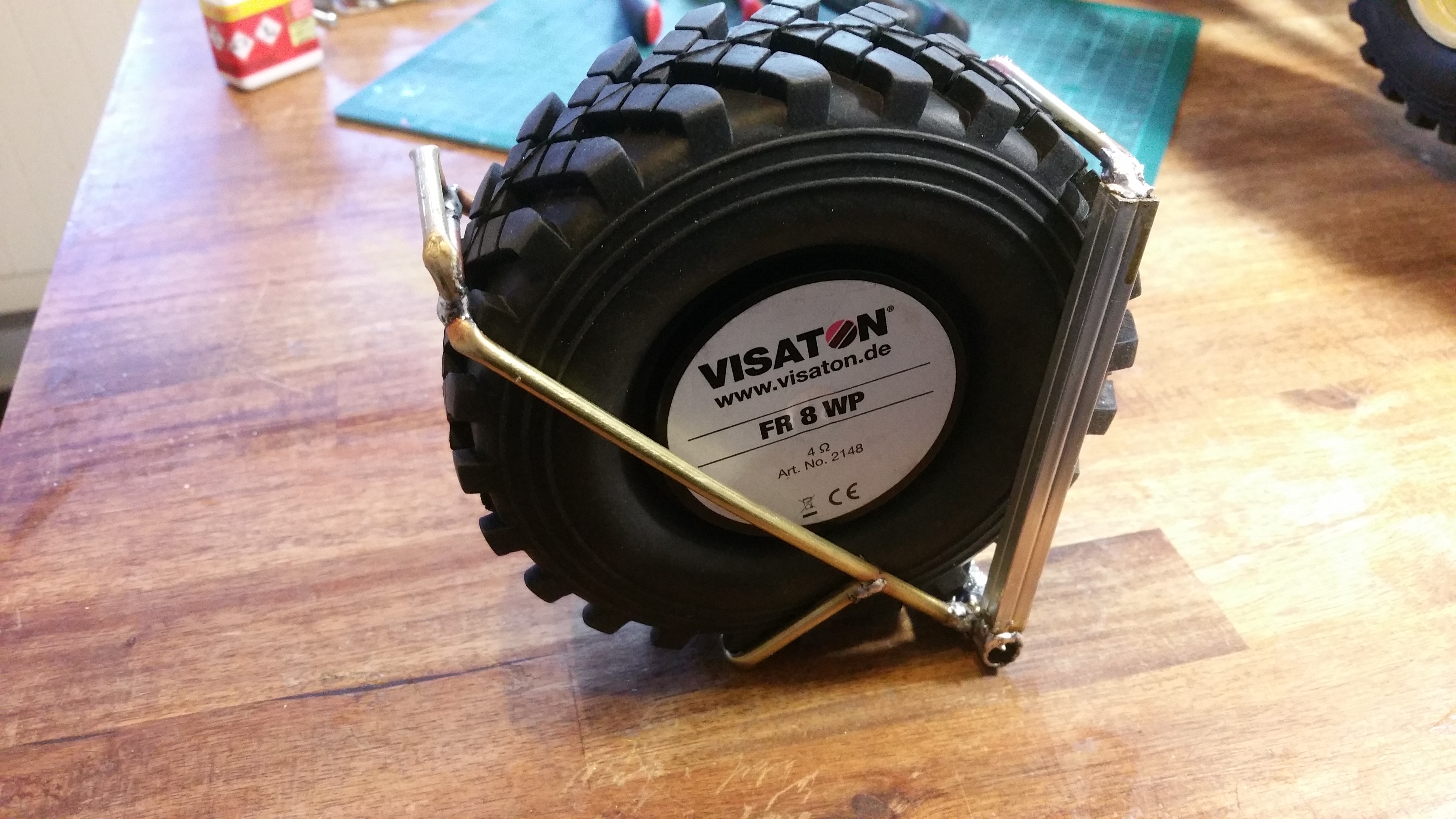 Ersatzrad Halter für das Heck aus Messing und Aluminium gelötet. Der Lautsprecher kommt als Felge in den Reifen.