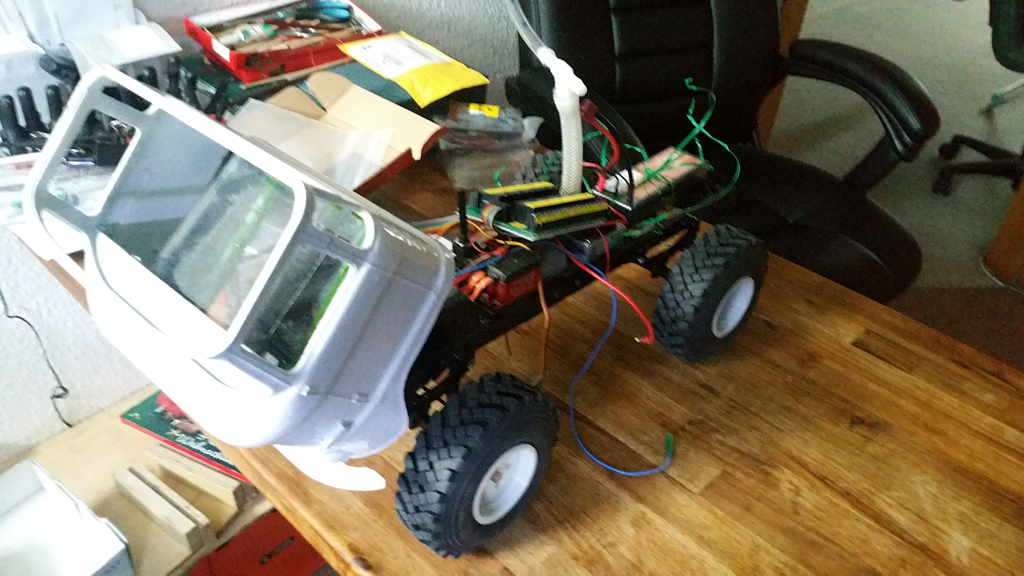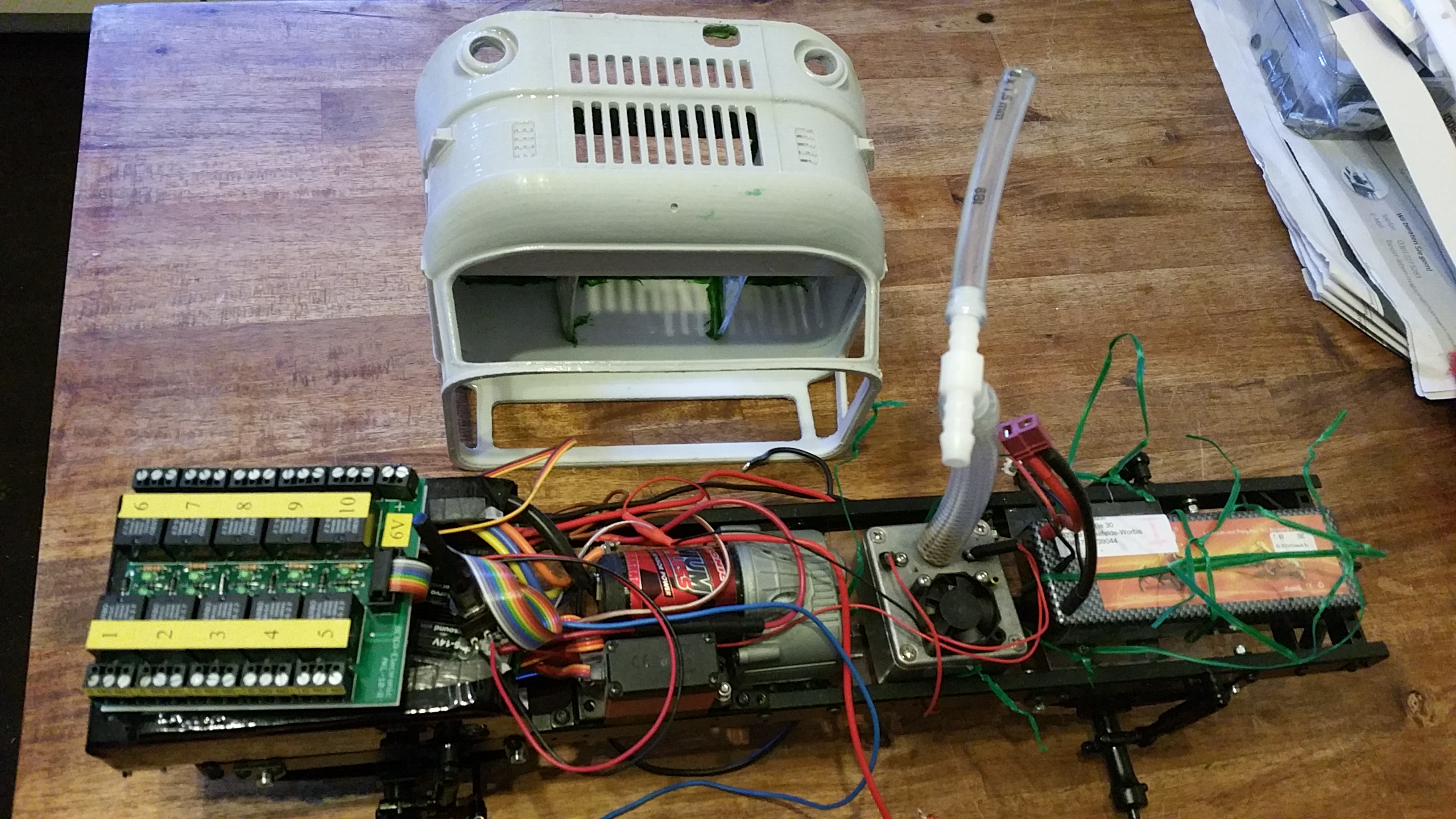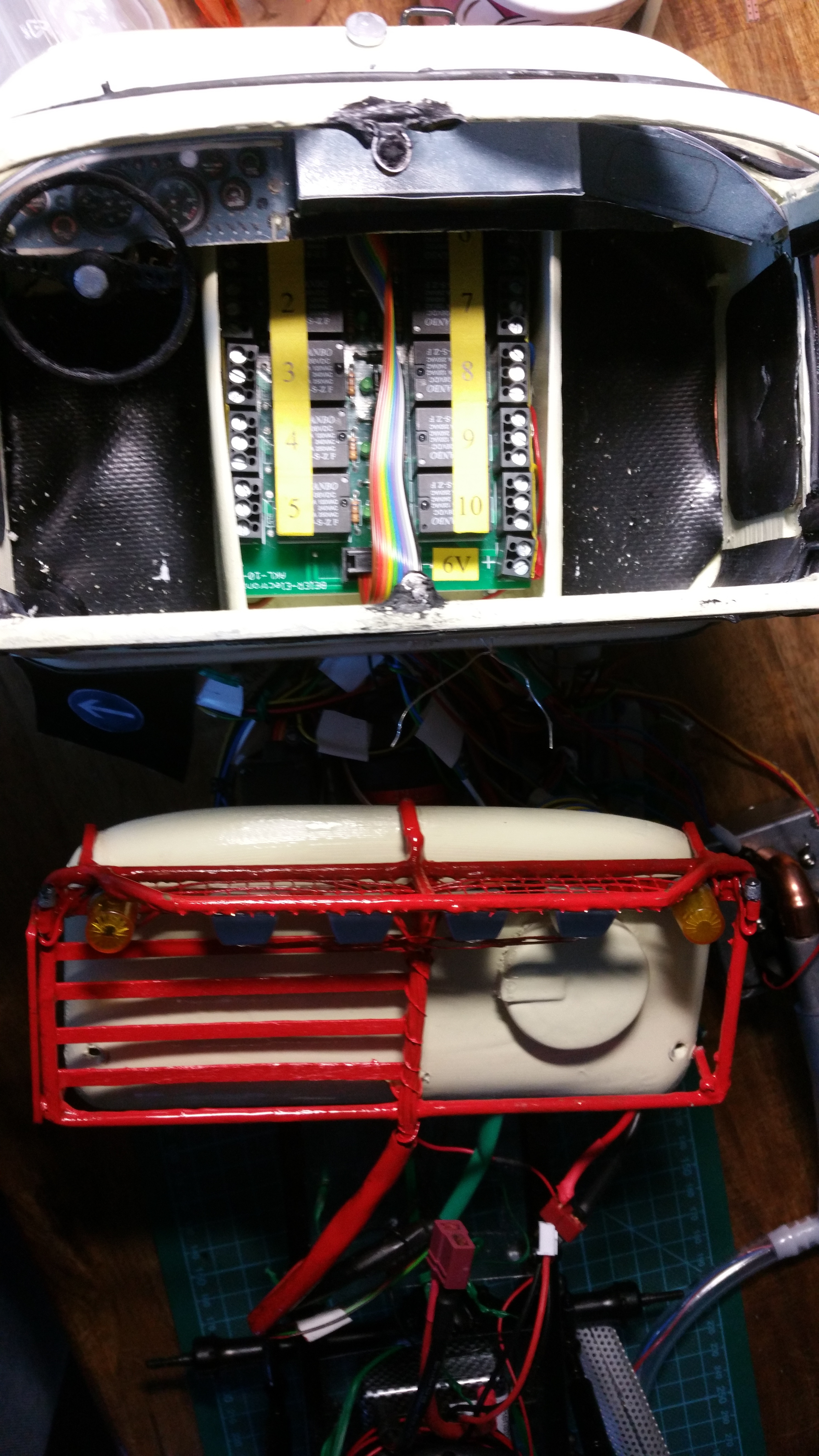 Nun soll das Fahrerhaus auf das Fahrgestell montiert werden, die Elektronik findet im Motorraum ihren Platz.
