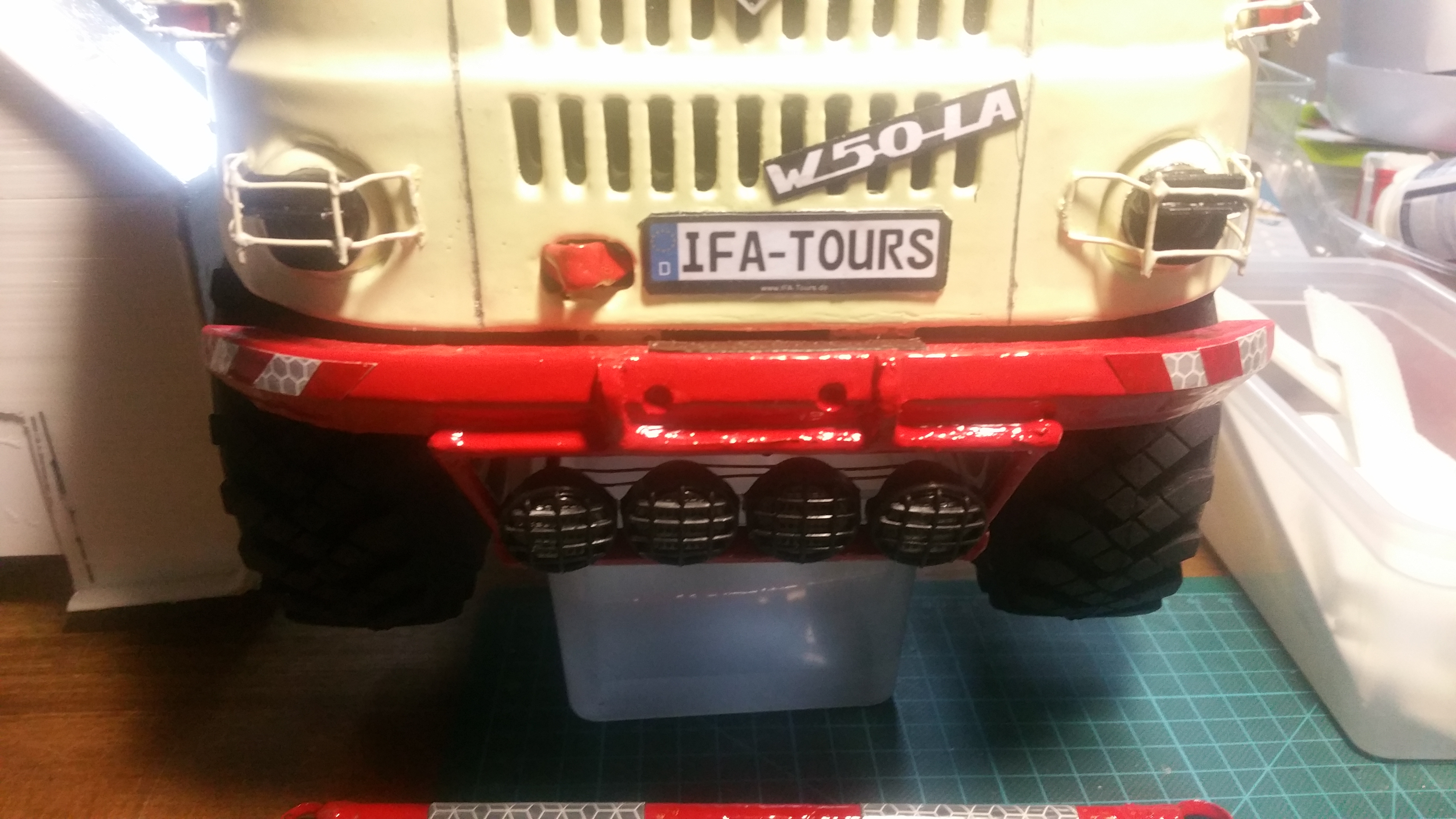 Stoßstange, Lampengitter, Tarnscheinwerfer, Abschleppösen, Schriftzug, Nummernschild, Zusatzscheinwerfer, IFA Raute, Blinkerschutzgitter, Kühlerdeckel, Radioantenne, Griff usw. montiert.