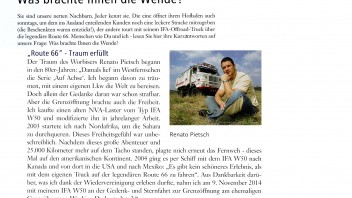 Der Traum des Worbisers Renato Pietsch begann in den 80er Jahren: “Damals lief im Westfernsehen die Serie “Auf Achse”. Ich begann davon zu träumen, mit einem eigenen LKW die Welt zu bereisen. Doch allein der Gedanke war schon strafbar. Aber die Grenzöffnung brachte auch die Freiheit. Ich kaufte einen alten NVA-Laster vom Typ IFA W50 und modifizierte ihn in jahrelanger Arbeit. 2003 startete ich nach Nordafrika, um die Sahara zu durchqueren. Das Freiheitsgefühl war unbeschreiblich. Nachdem dieses große Abenteuer und 25.000 Kilometer mehr auf dem Tacho standen, plagte mich erneut das Fernweh – dieses Mal auf den amerikanischen Kontinent. 2004 ging es per Schiff mit dem IFA W50 nach Kanada und von dort in die USA und nach Mexiko: “Es gibt kein schöneres Erlebnis, als mit dem eigenen Truck auf der legendären Route 66 zu fahren”. …..