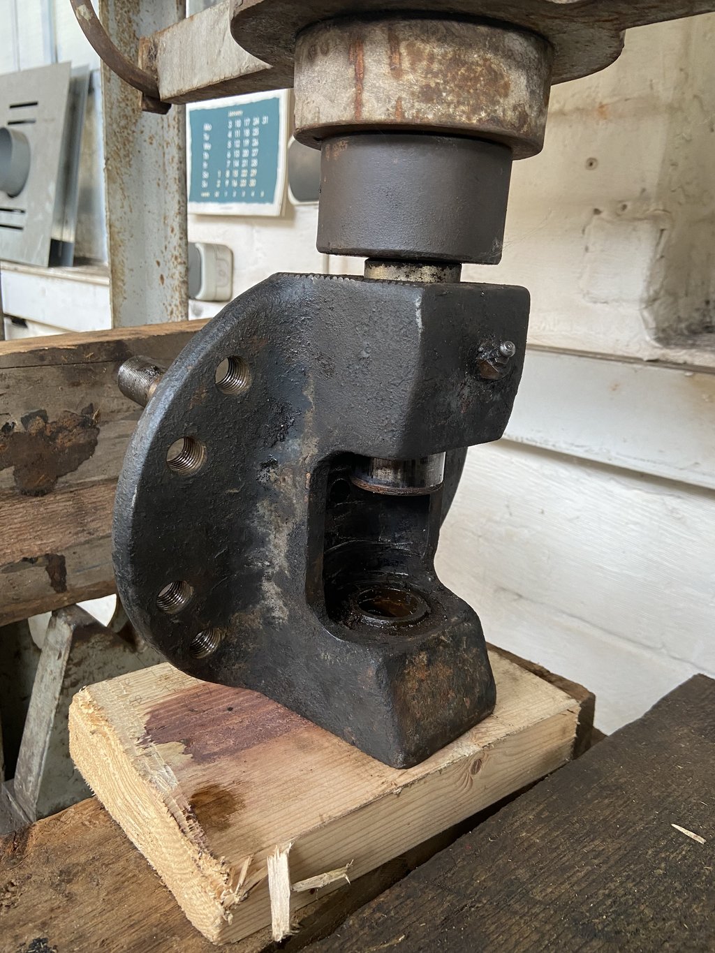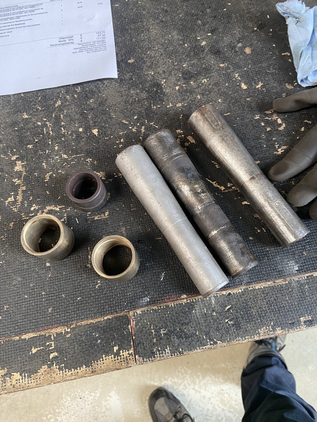 Diese ist oben kleiner als unten. Also muss er nach unten rausgetrieben werden. Ich habe mit aus einem alten Bolzen mit gleichem Außenmaß ein 2 cm Stück geschnitten und oben aufgelegt. Und ein paar sehr kräftige Schläge mit dem Vorschlaghammer. Der Bolzen kam dann langsam nach unten raus.
