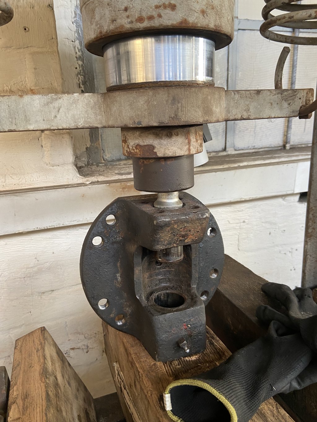 Die beiden alten Buchsen habe ich unter einer Presse ausgedrückt. Jeweils von außen nach innen. Eine 30er Nuss und eine 24er Nuss haben sich dafür super gemacht.