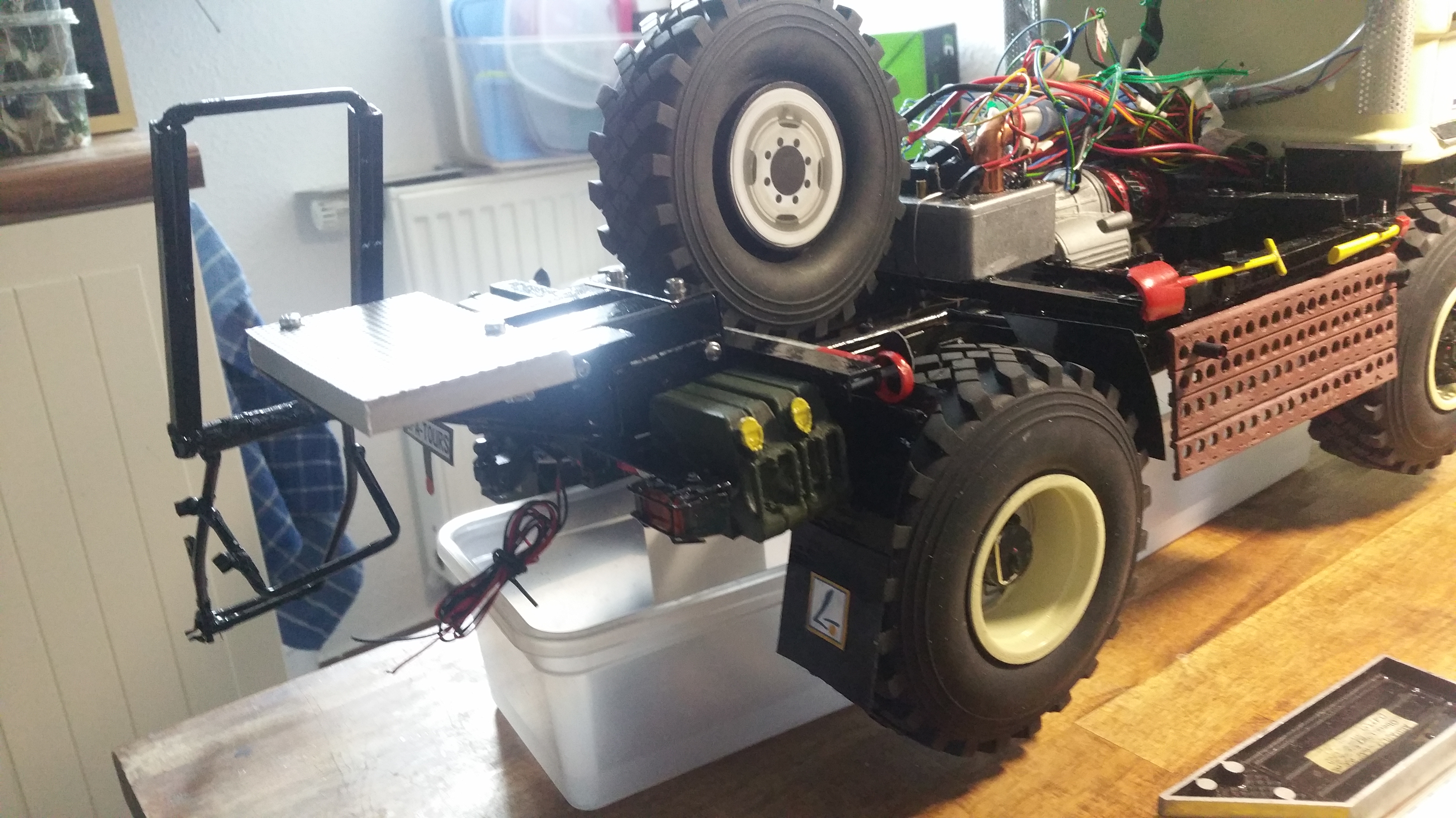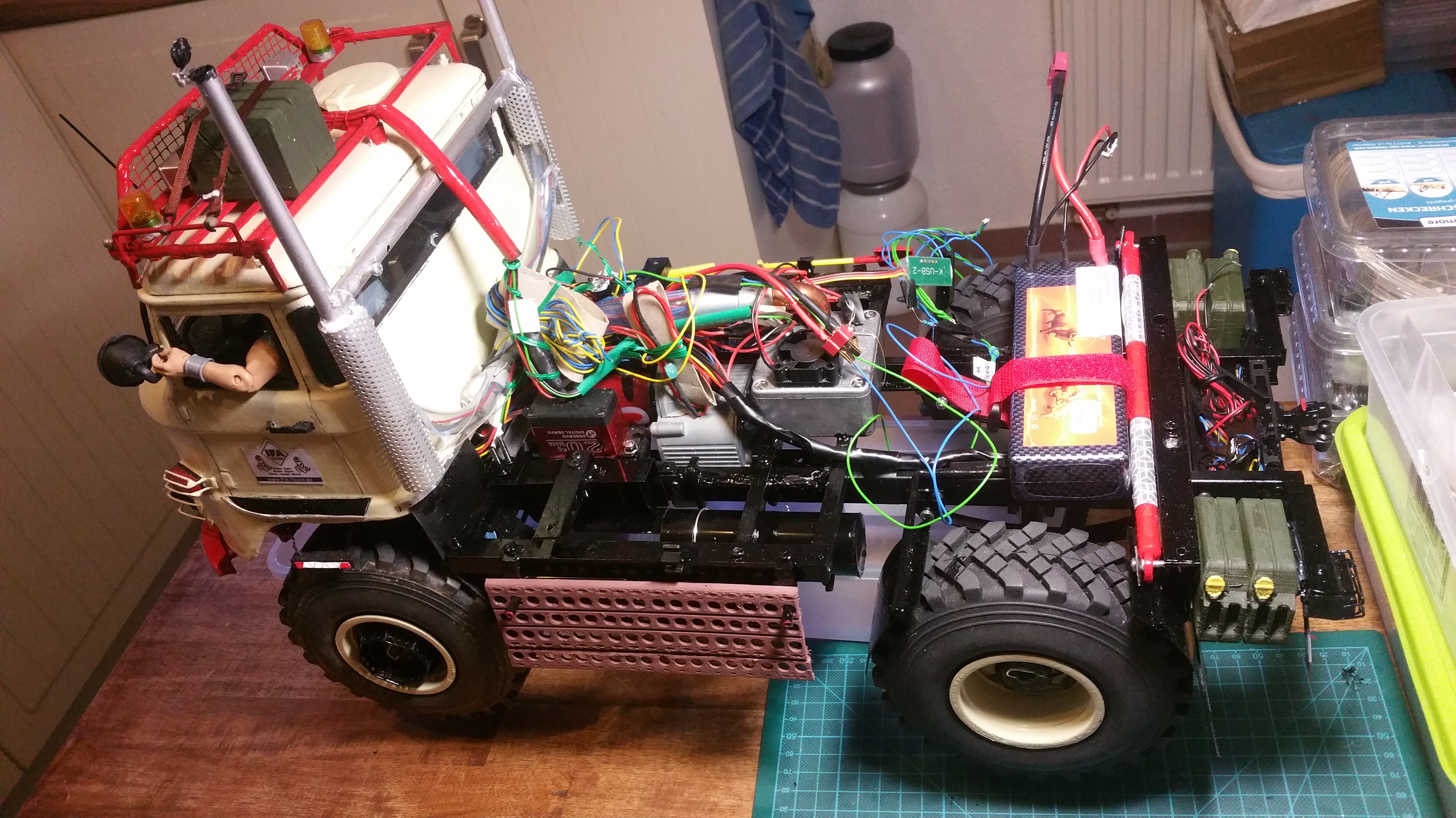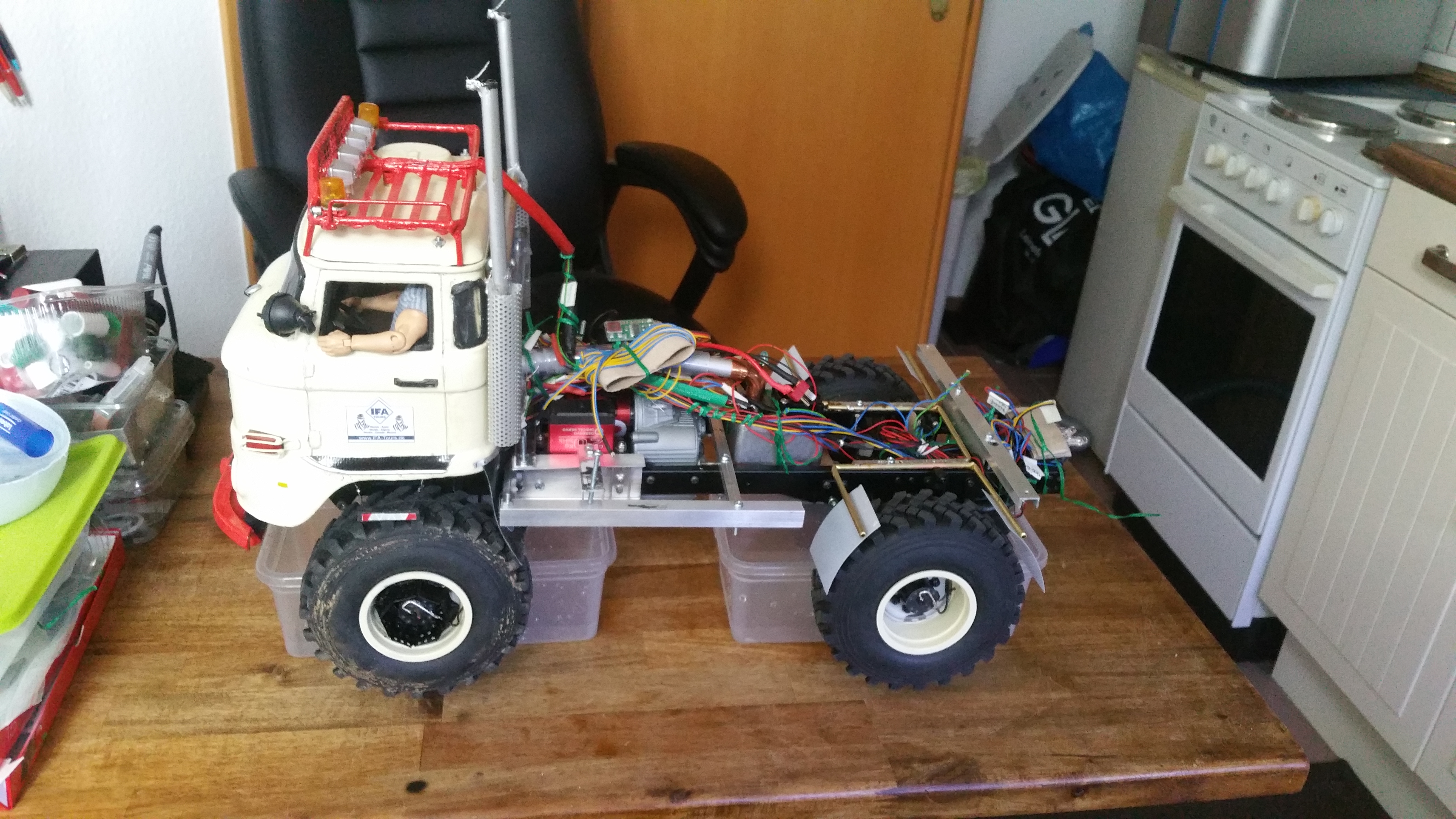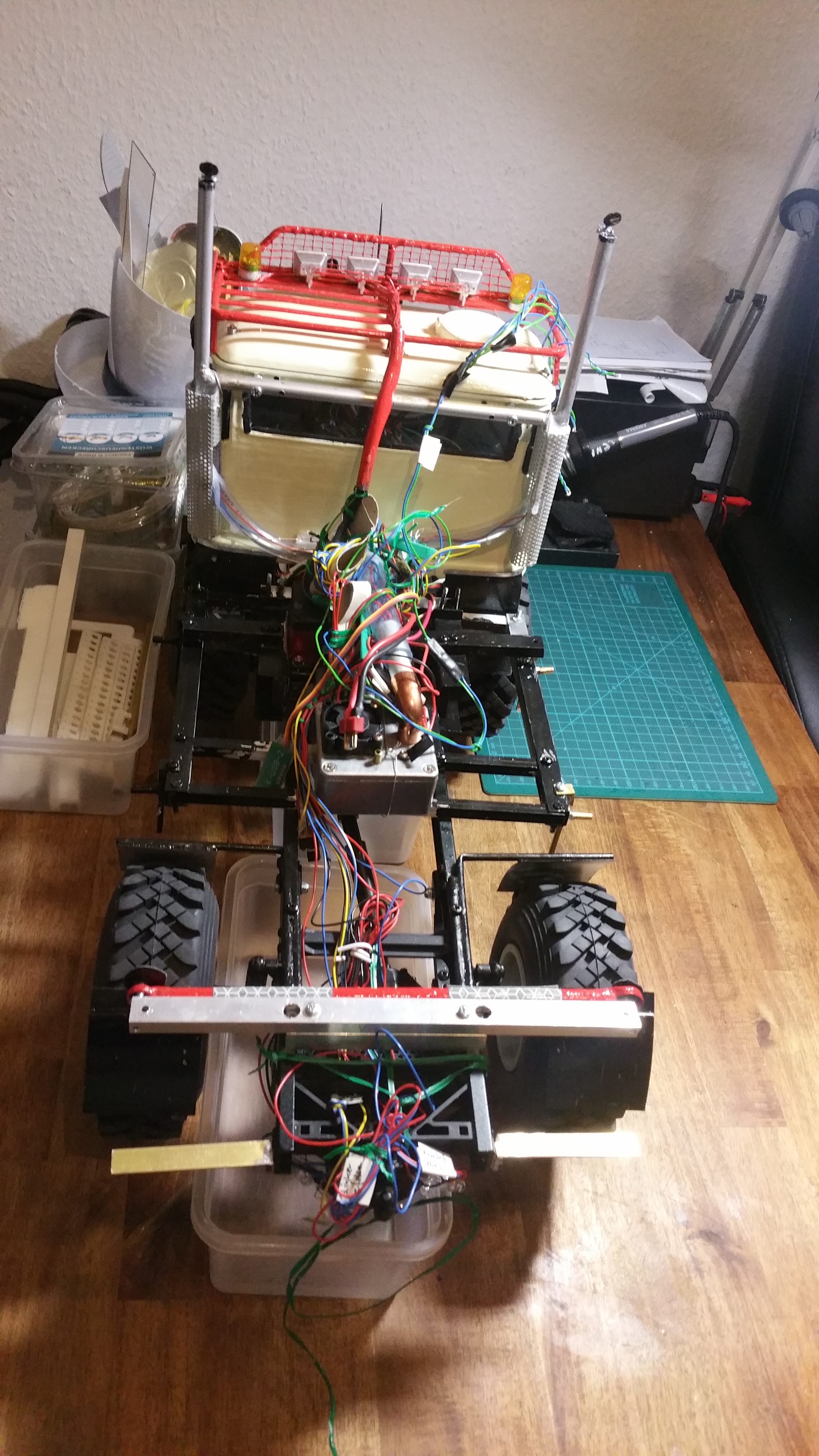 In der Woche wenn ich mit dem LKW unterwegs bin, arbeite ich dann an Baugruppen und Projekten, die dann am Wochenende am Modell komplettiert werden sollen. Im LKW habe ich bereits Dremel, Lötkolben, ein wenig Feinmechanikerwerkzeug usw. dabei.