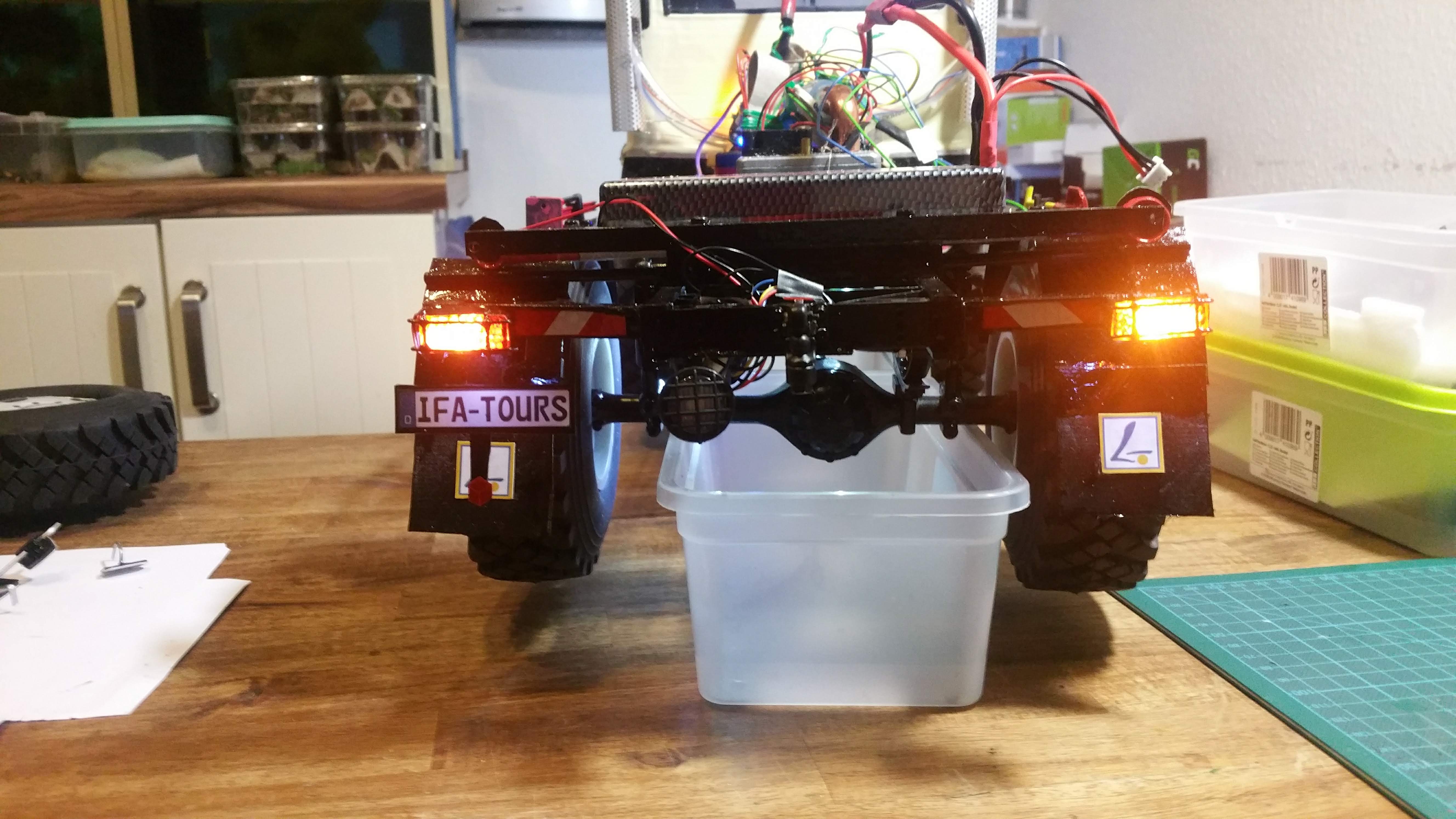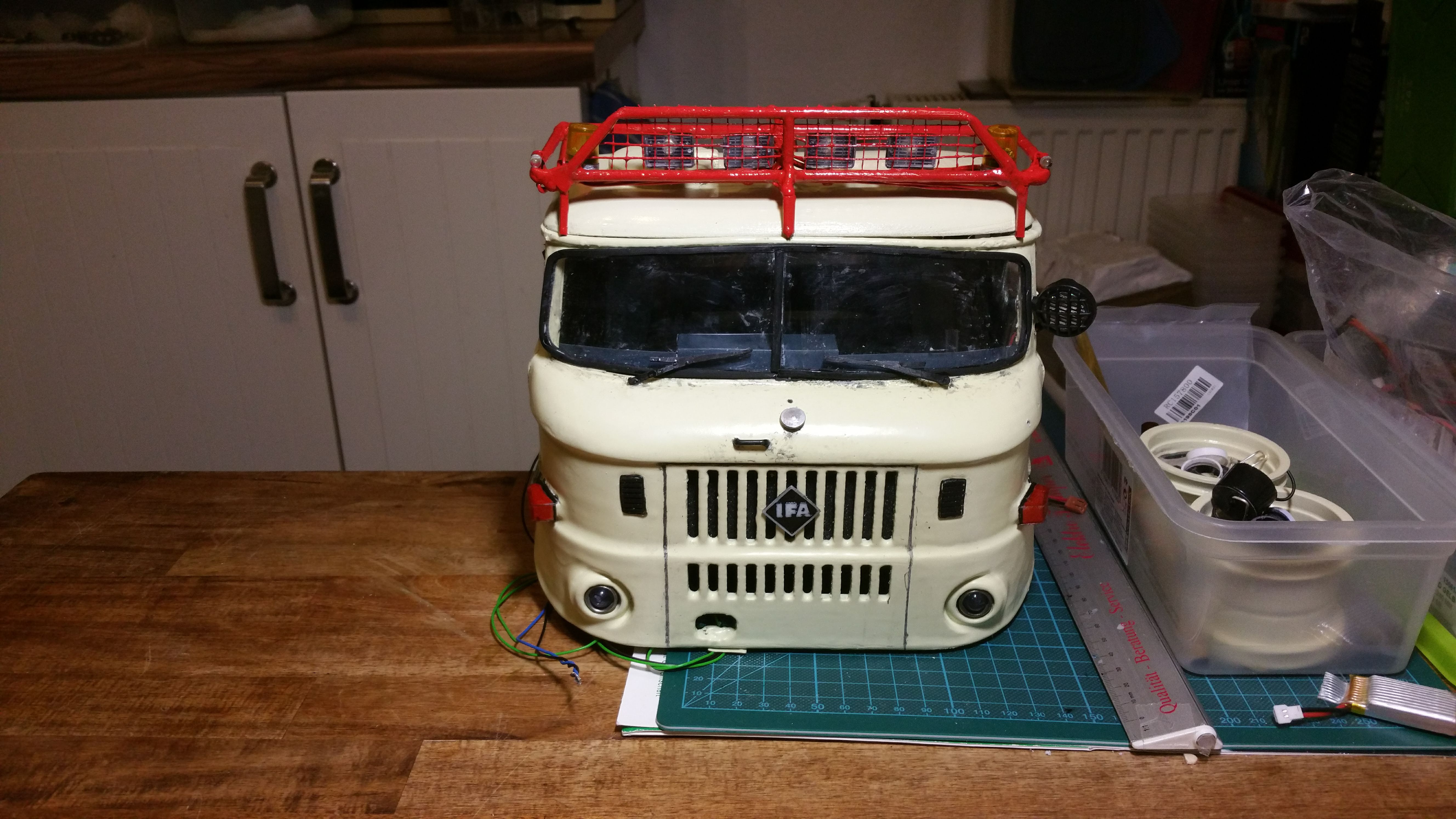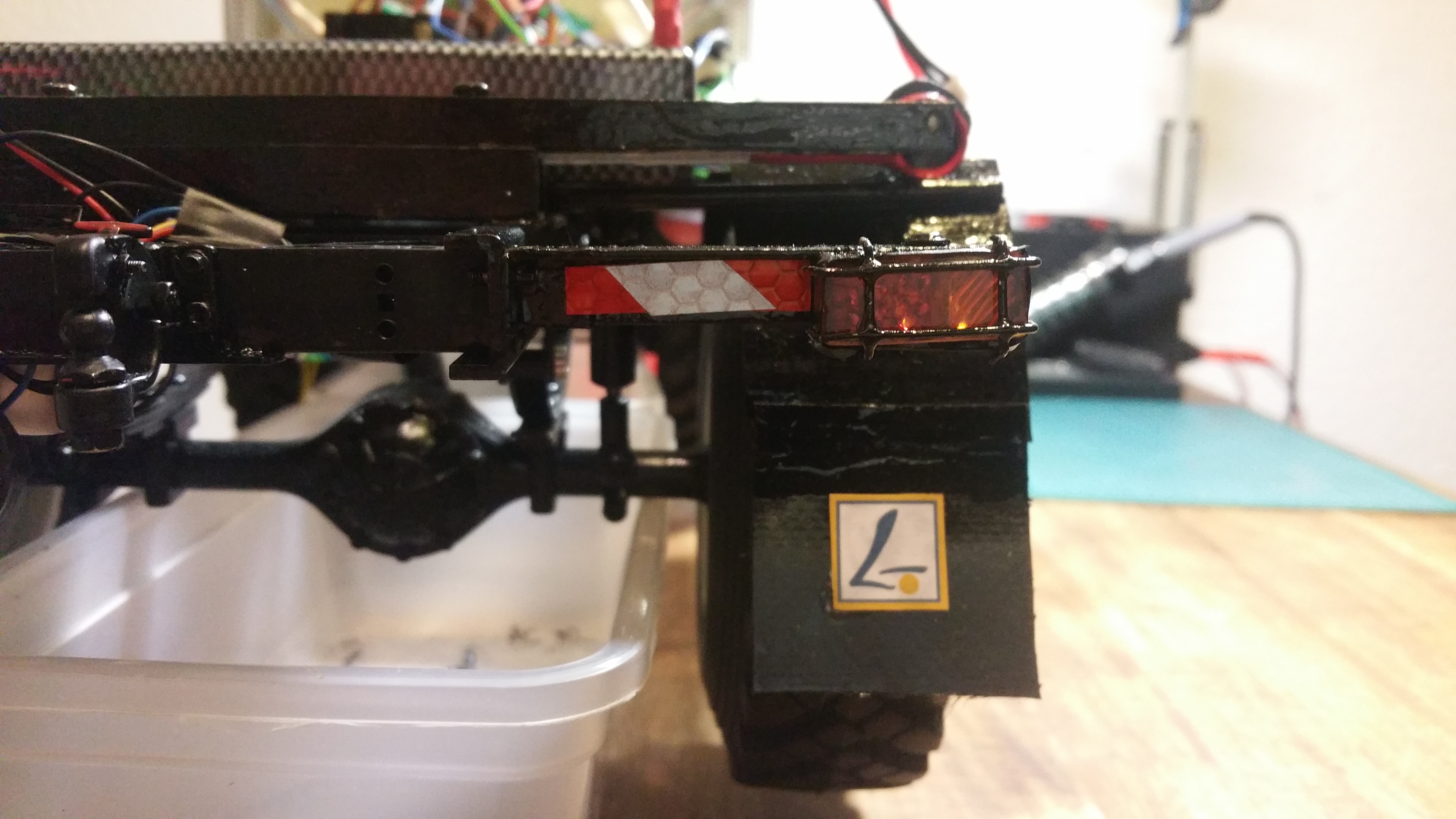 In der Woche wenn ich mit dem LKW unterwegs bin, arbeite ich dann an Baugruppen und Projekten, die dann am Wochenende am Modell komplettiert werden sollen. Im LKW habe ich bereits Dremel, Lötkolben, ein wenig Feinmechanikerwerkzeug usw. dabei.