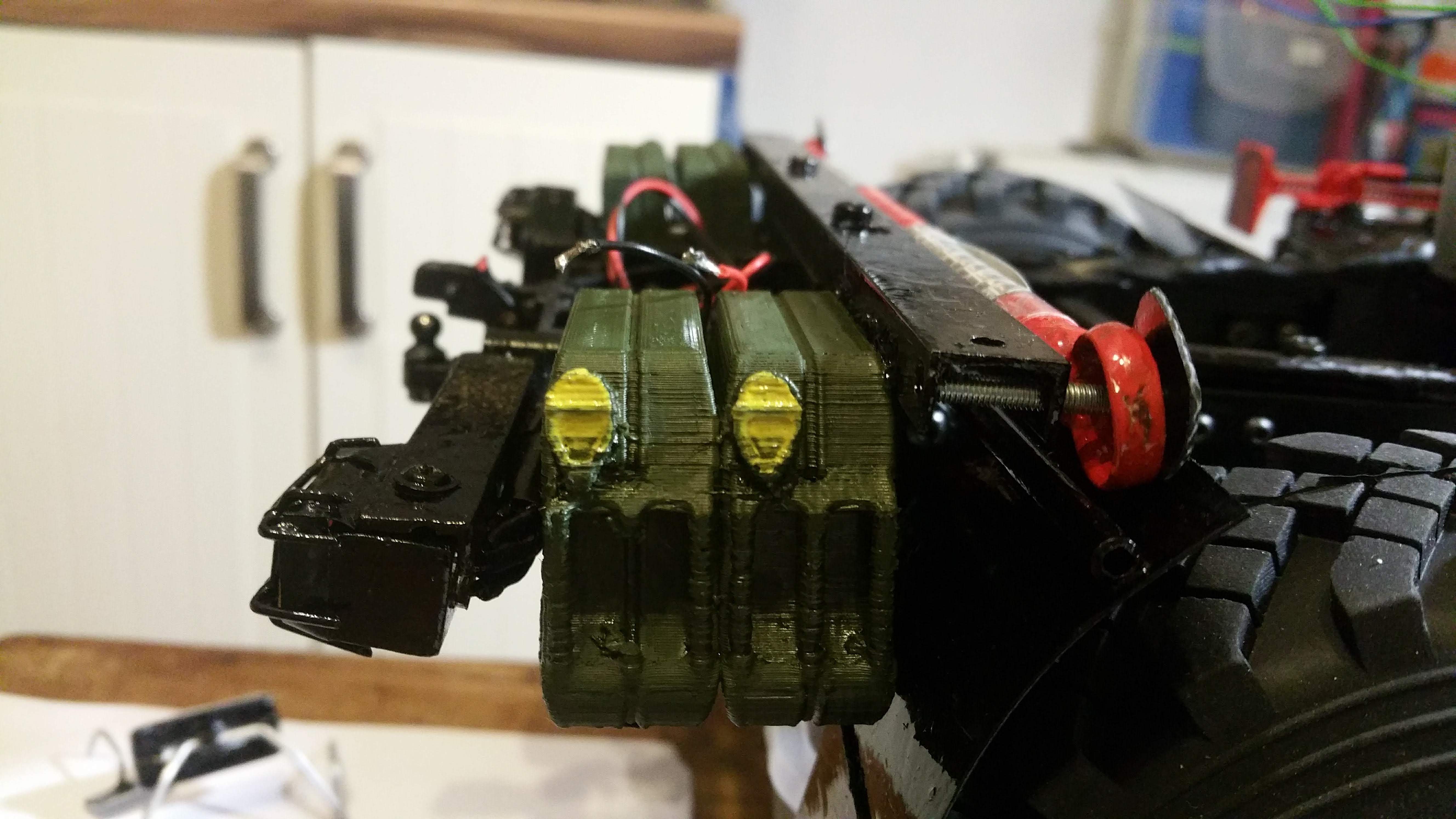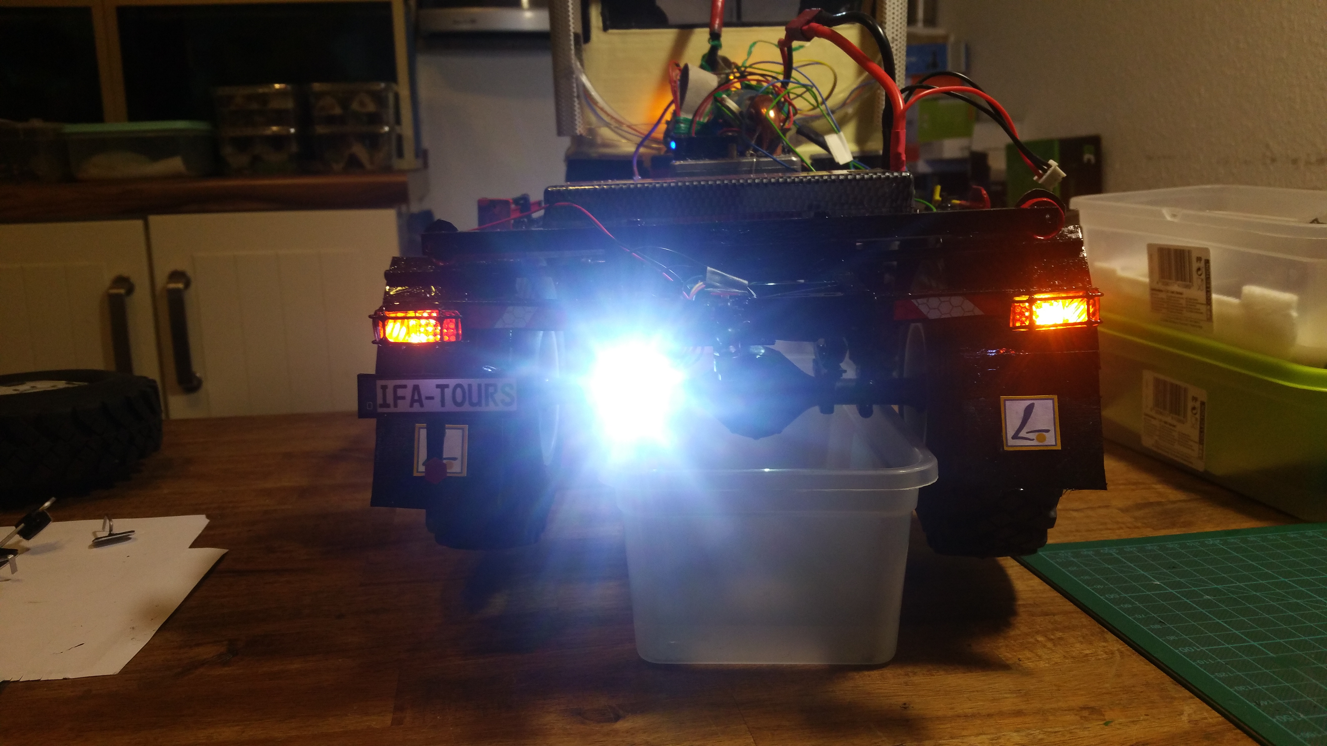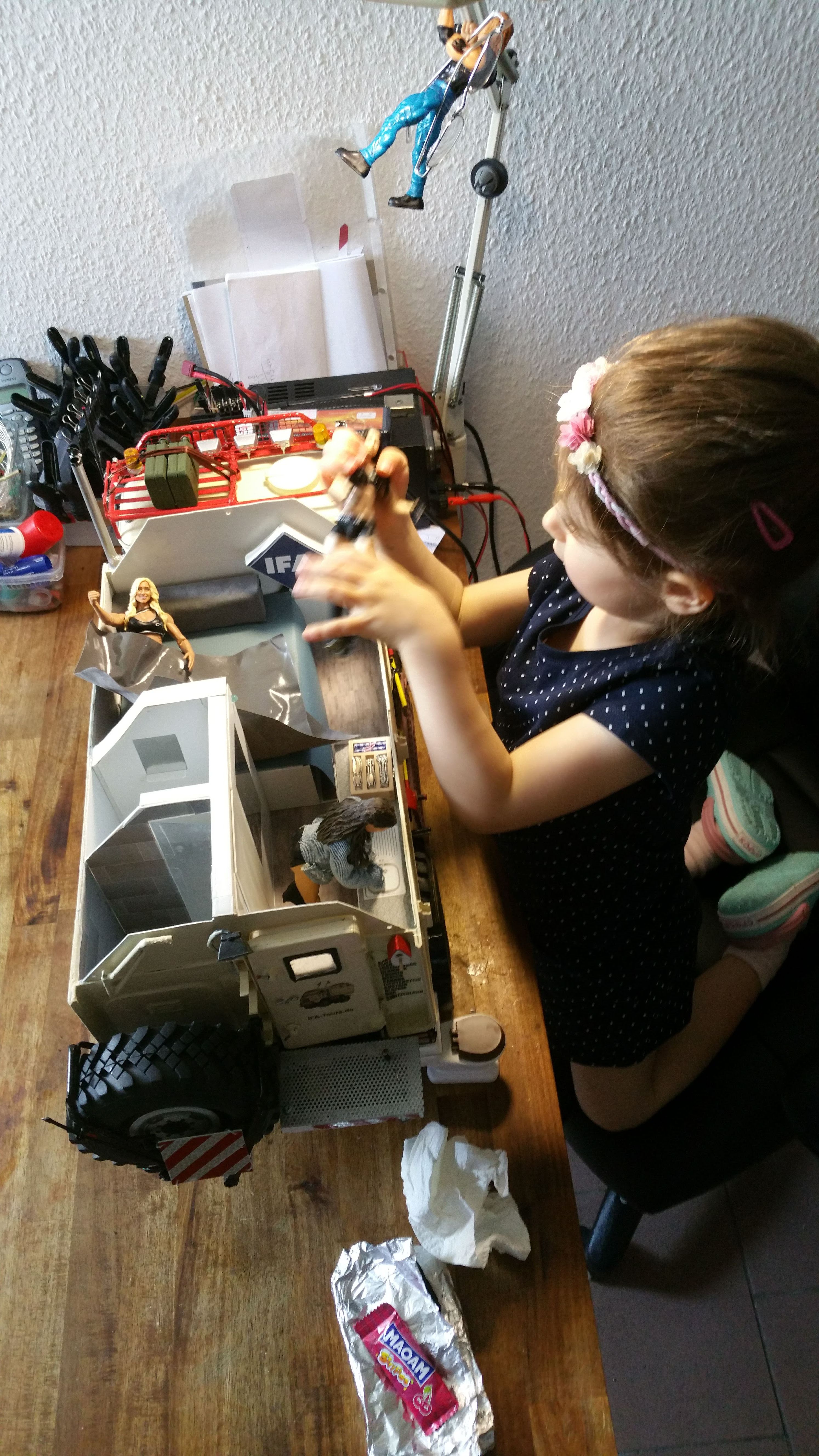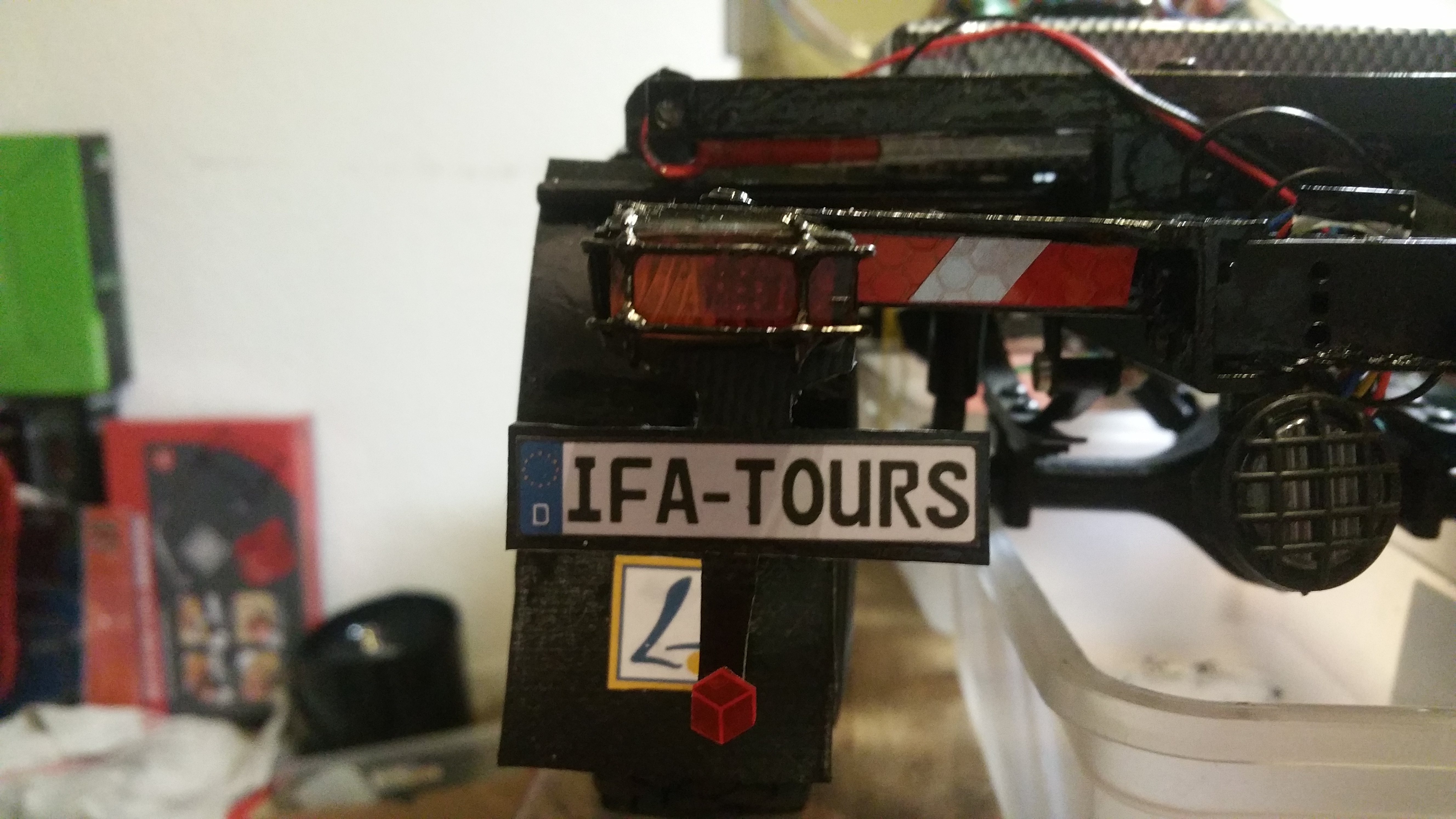 In der Woche wenn ich mit dem LKW unterwegs bin, arbeite ich dann an Baugruppen und Projekten, die dann am Wochenende am Modell komplettiert werden sollen. Im LKW habe ich bereits Dremel, Lötkolben, ein wenig Feinmechanikerwerkzeug usw. dabei.