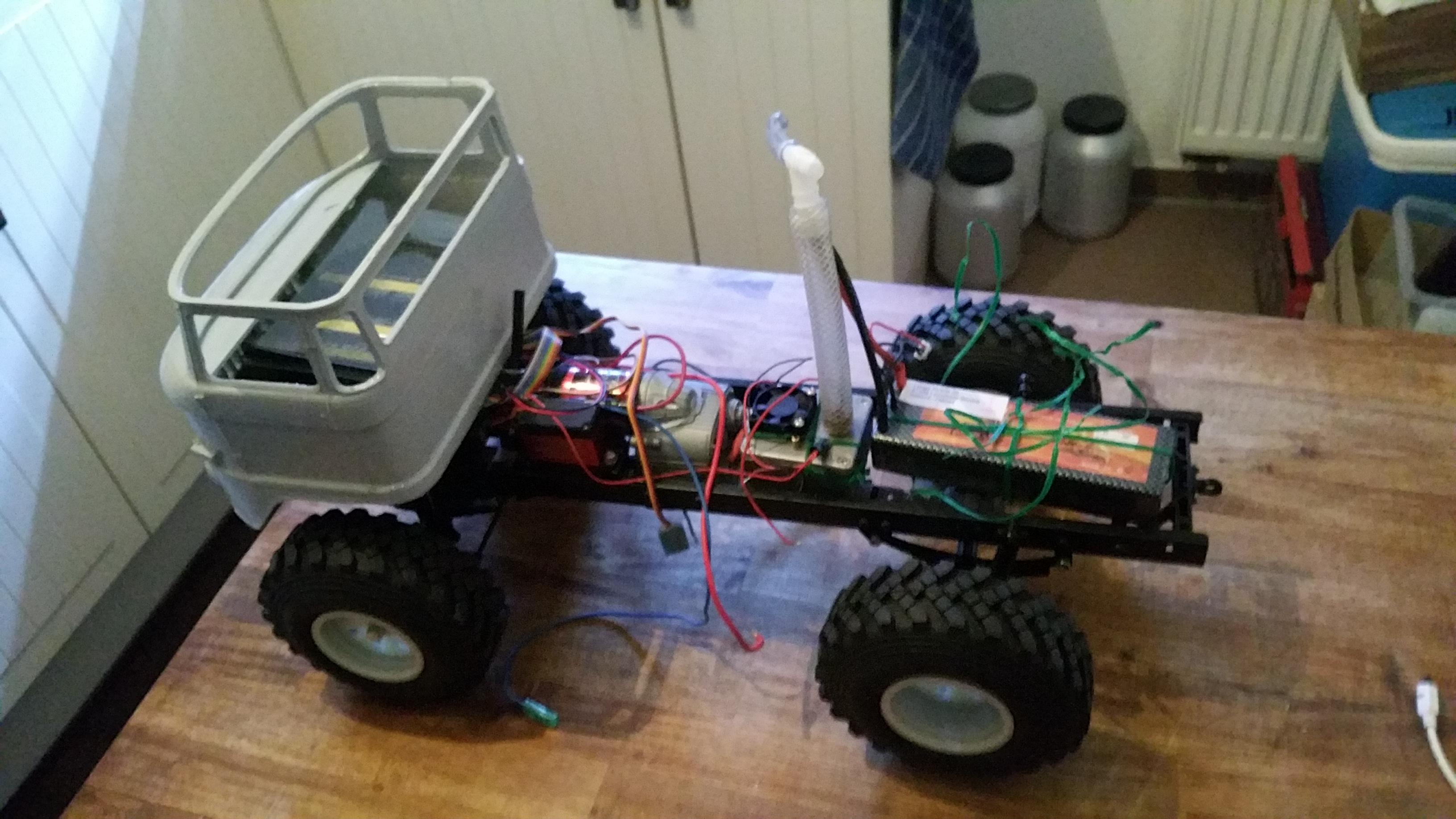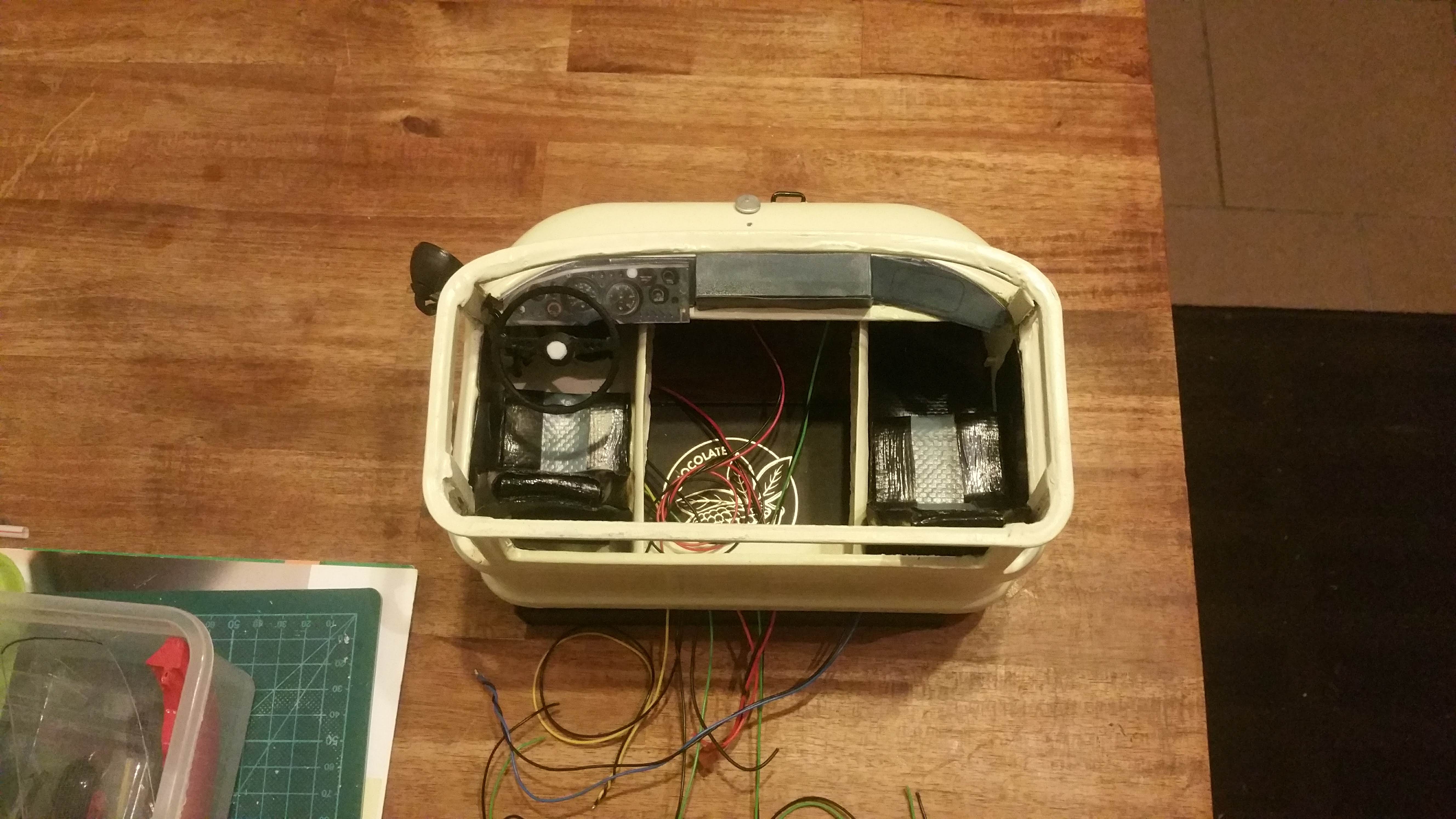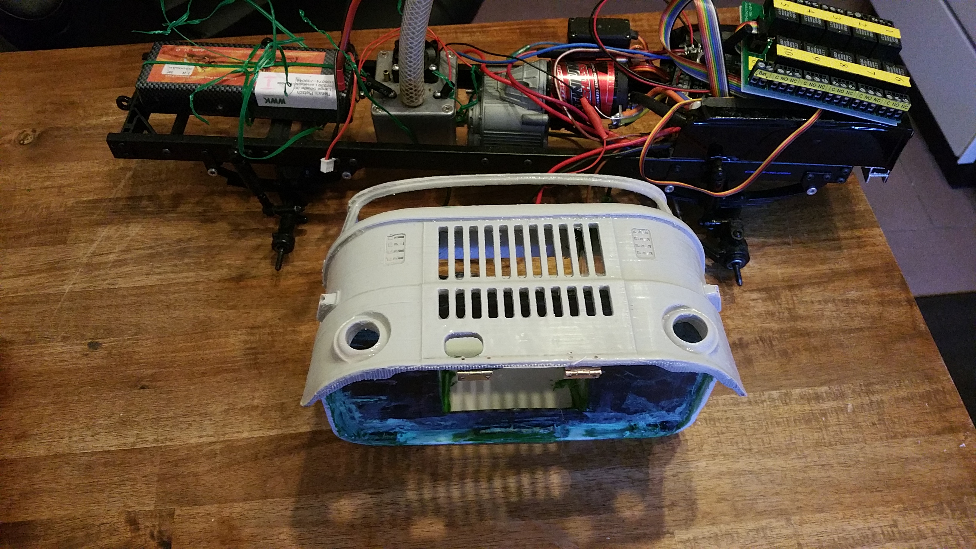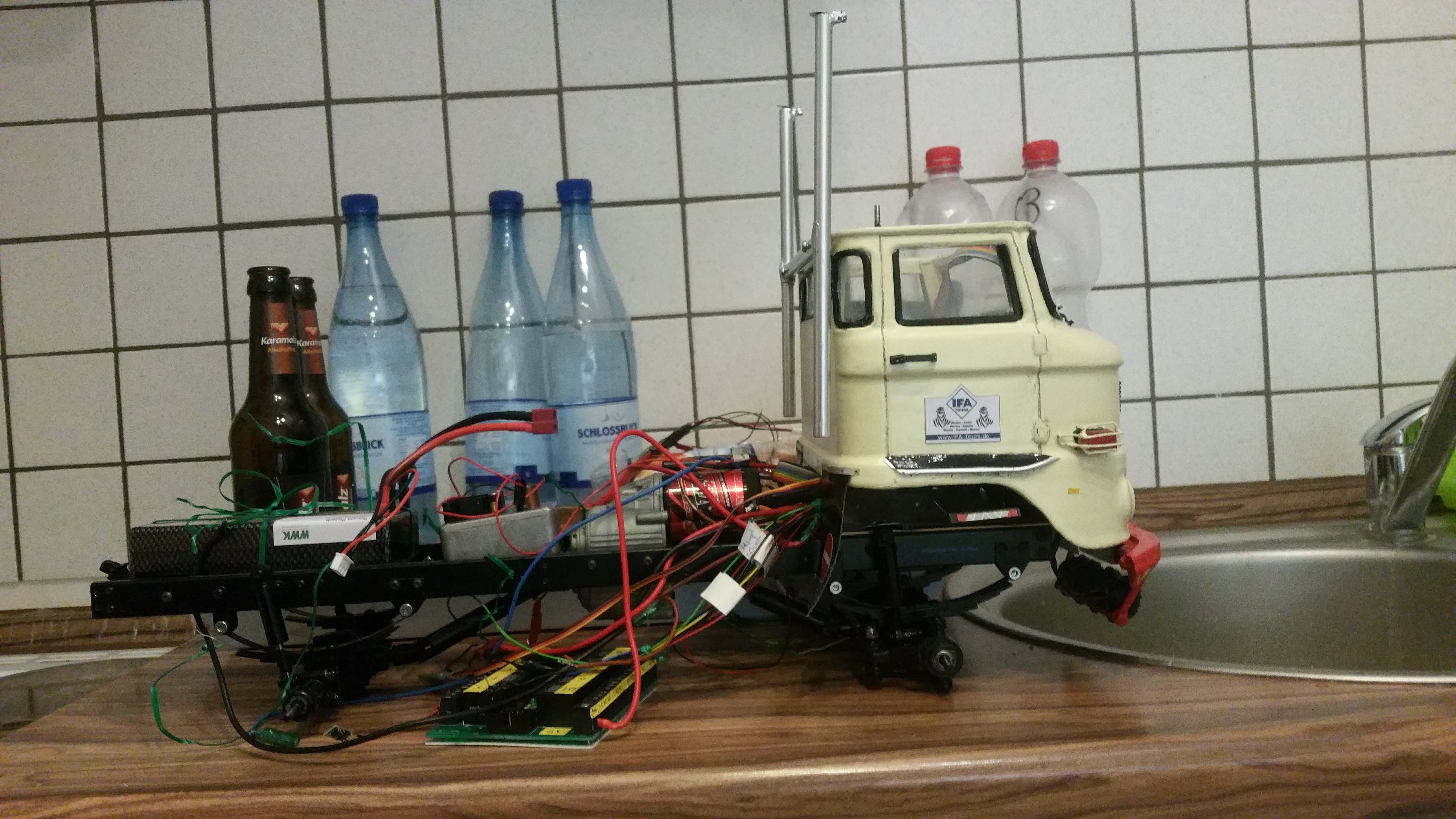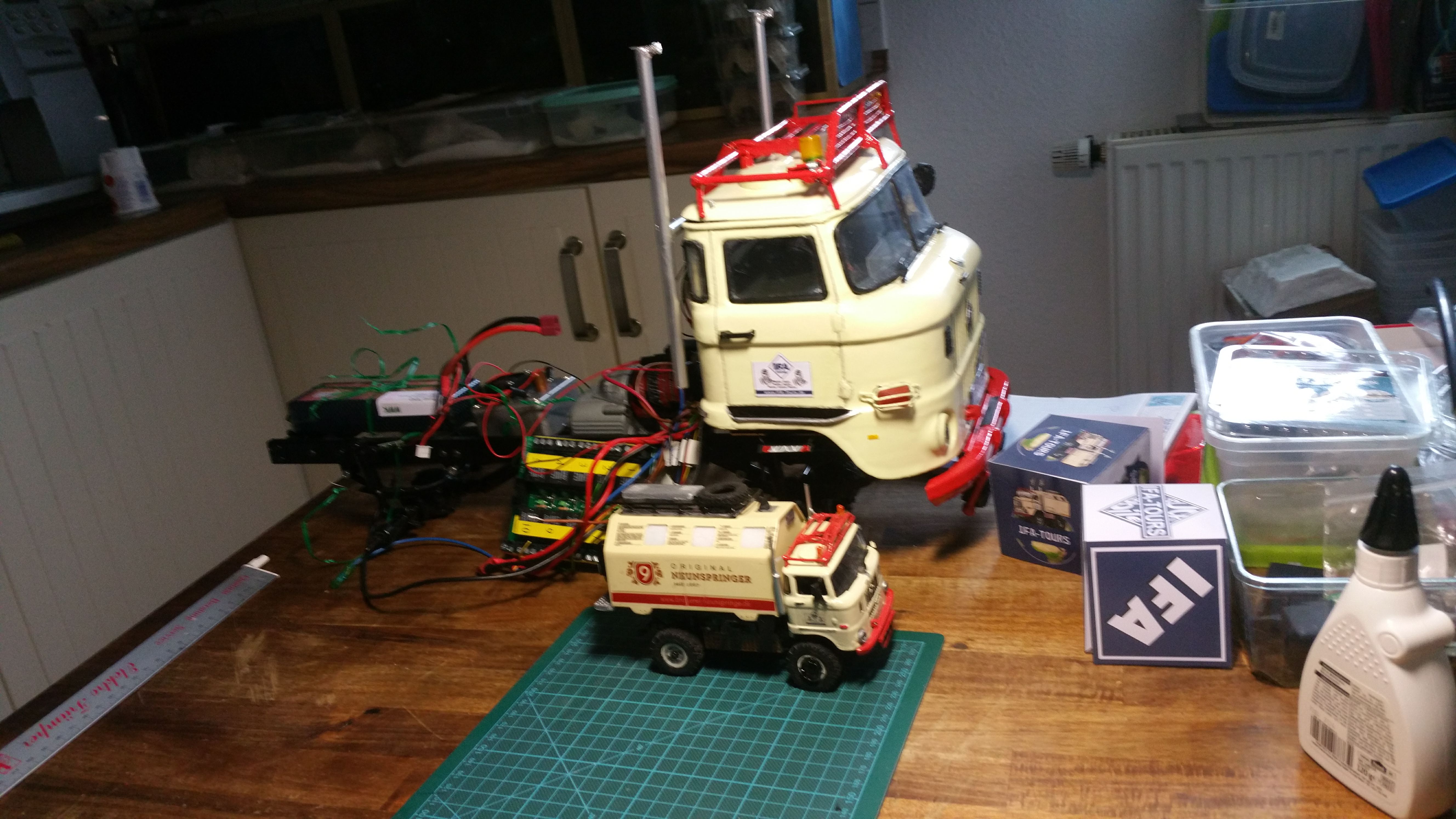 Nun soll das Fahrerhaus auf das Fahrgestell montiert werden, die Elektronik findet im Motorraum ihren Platz.