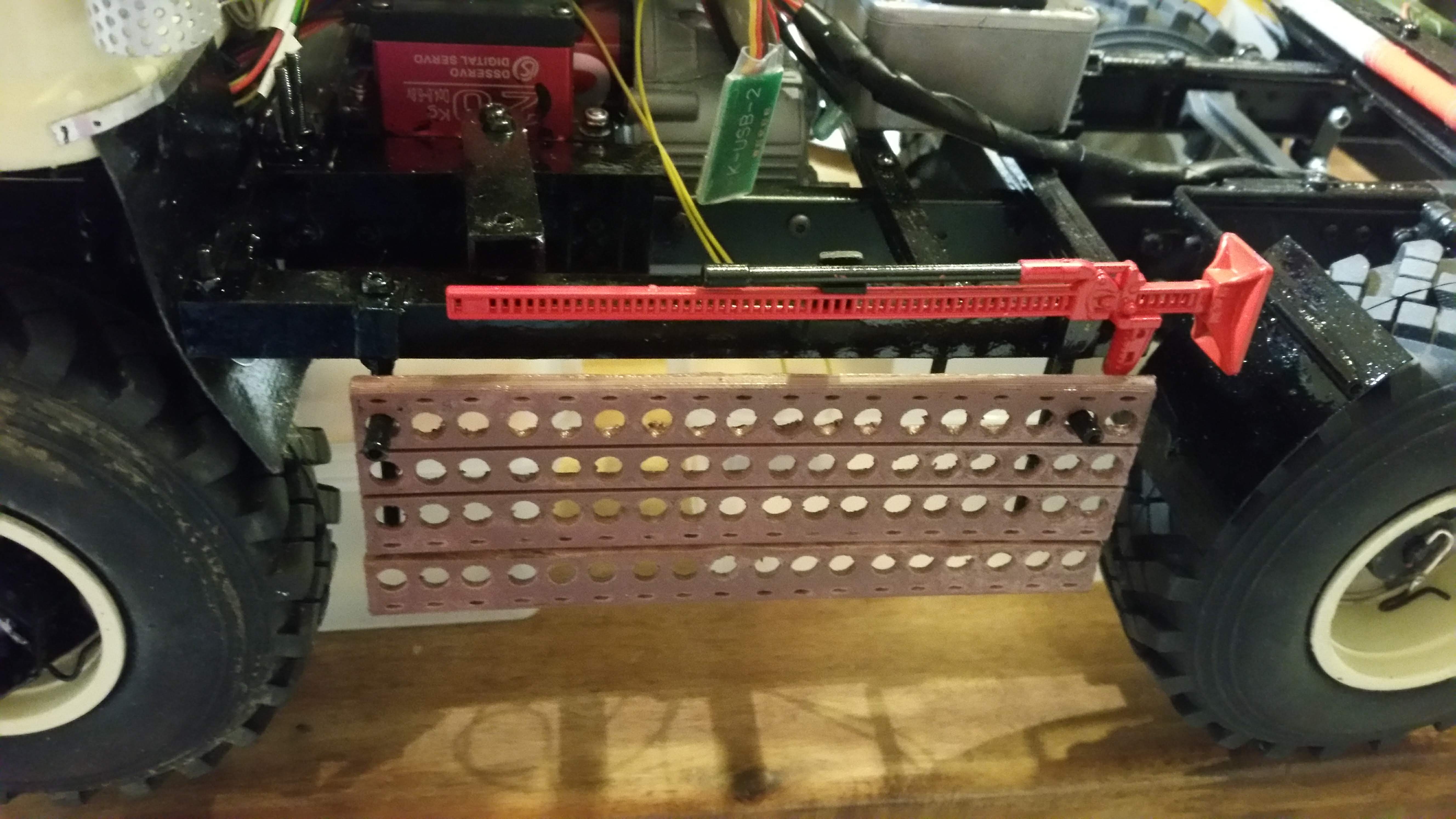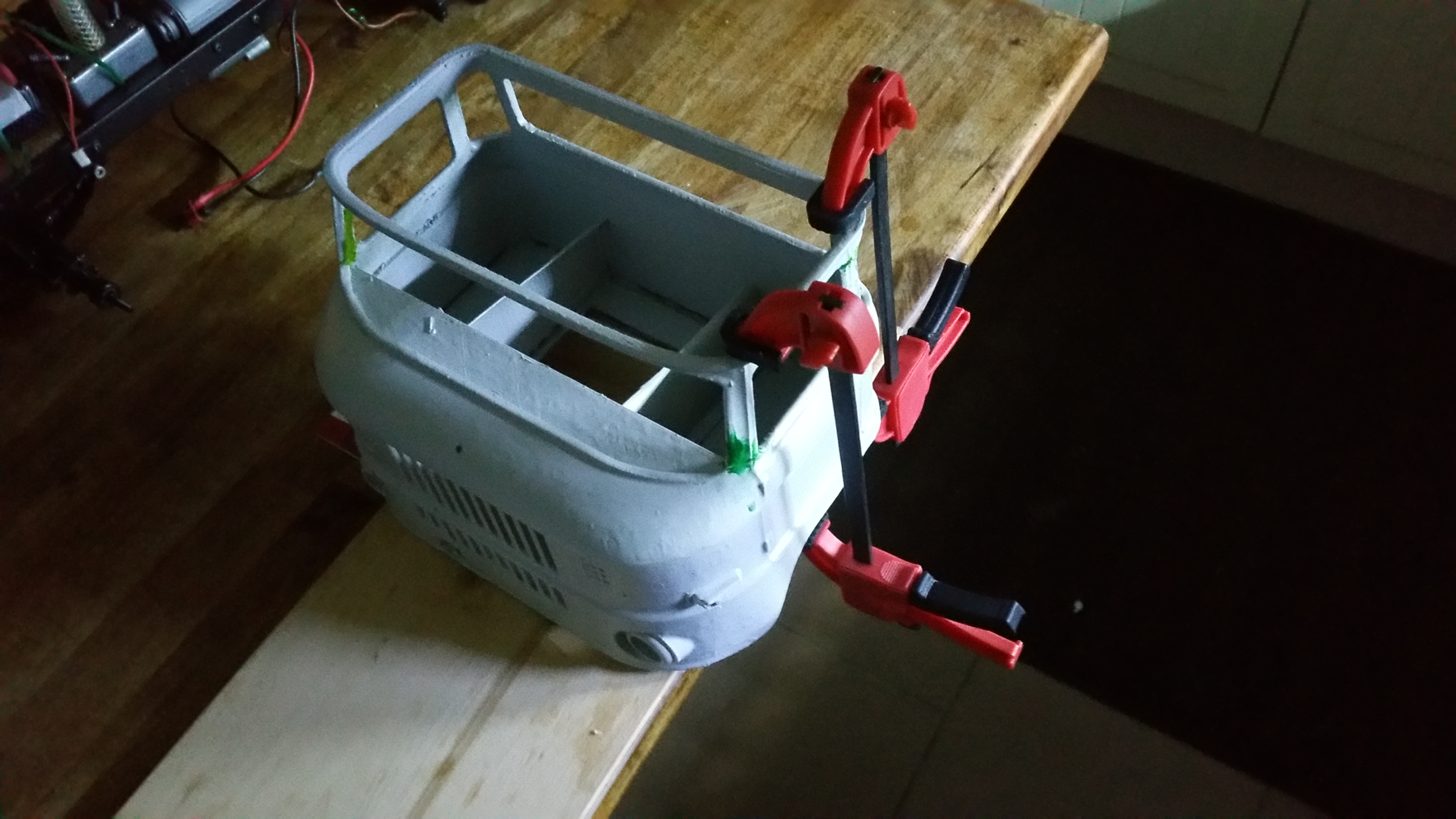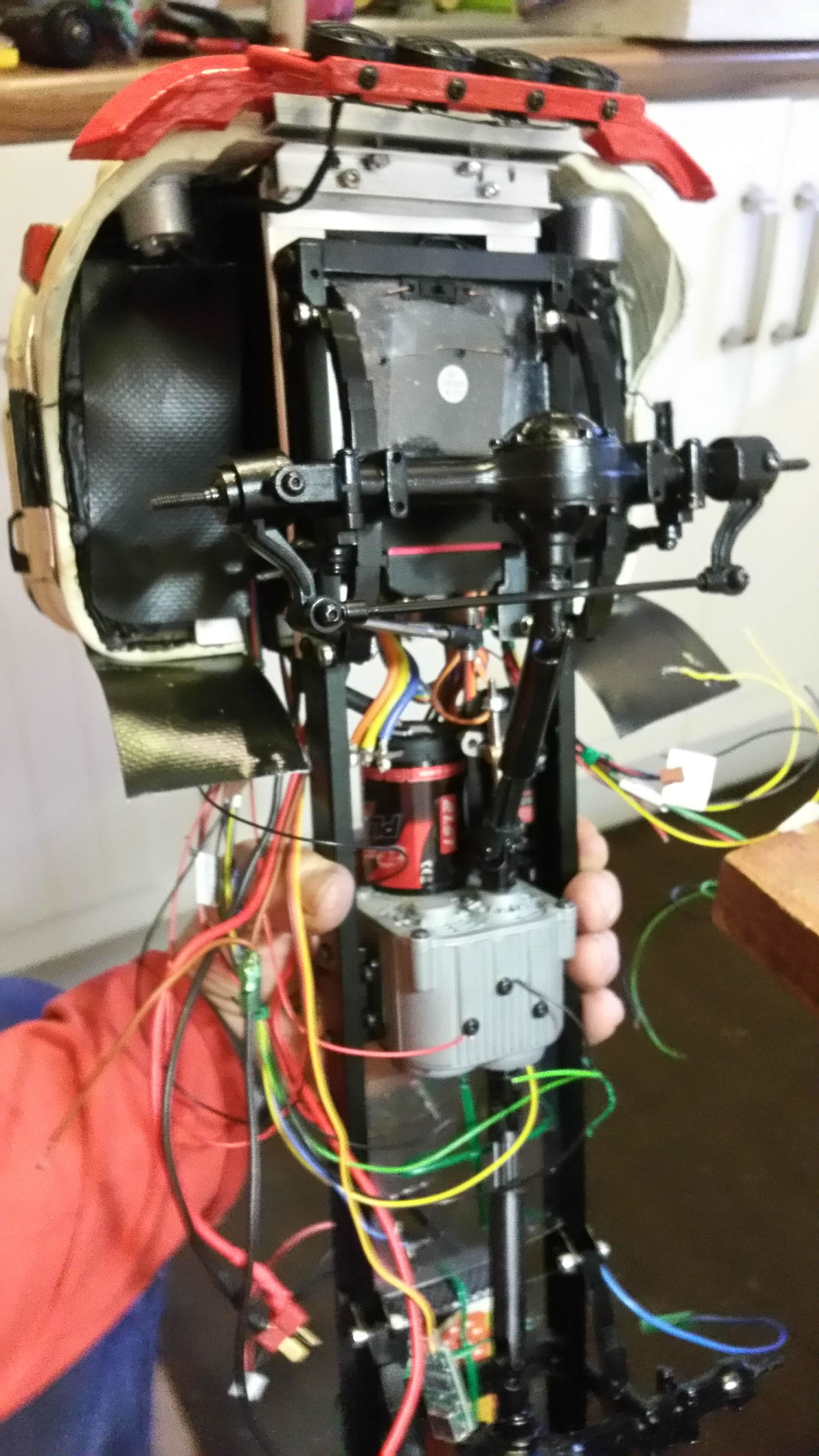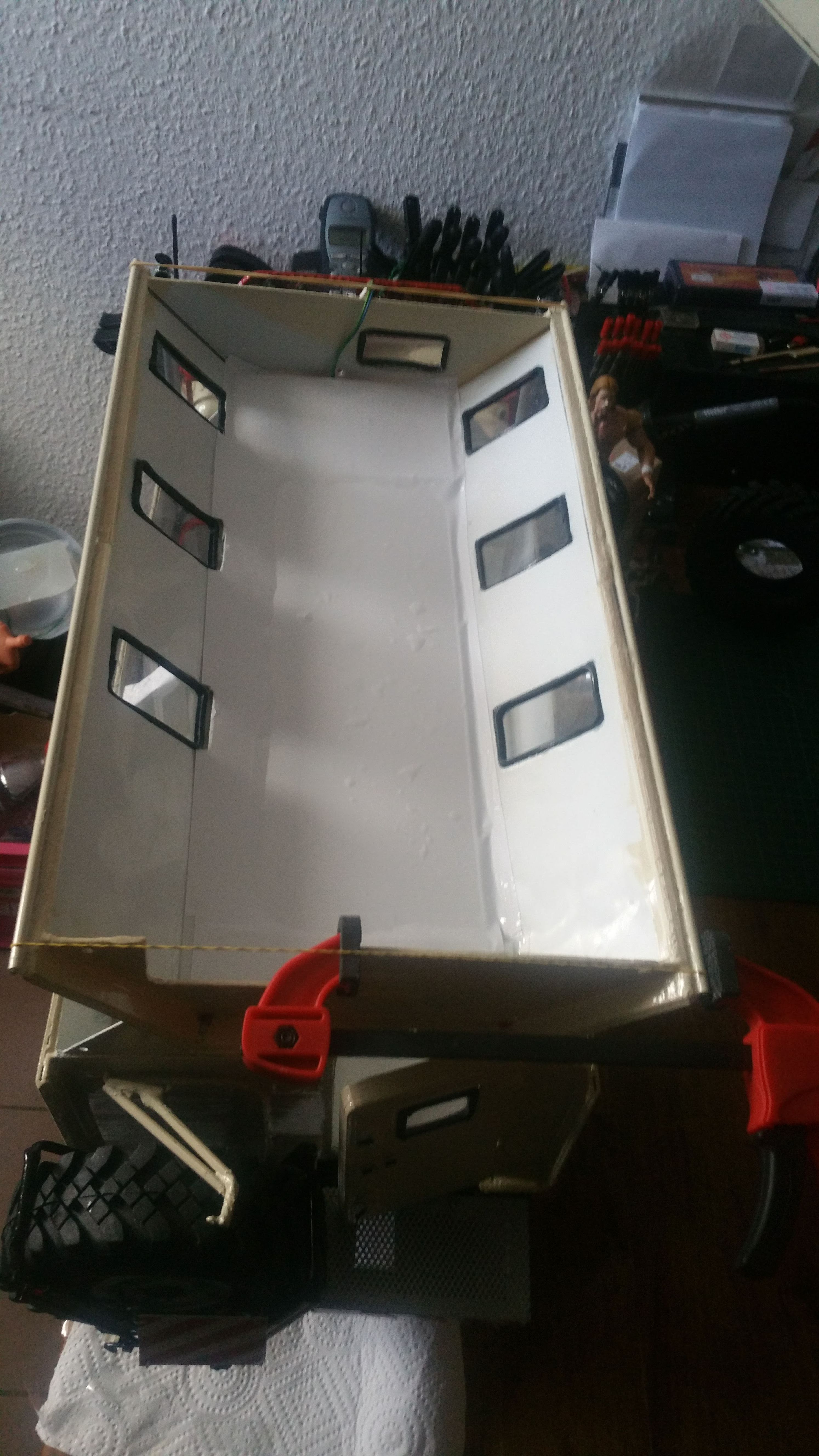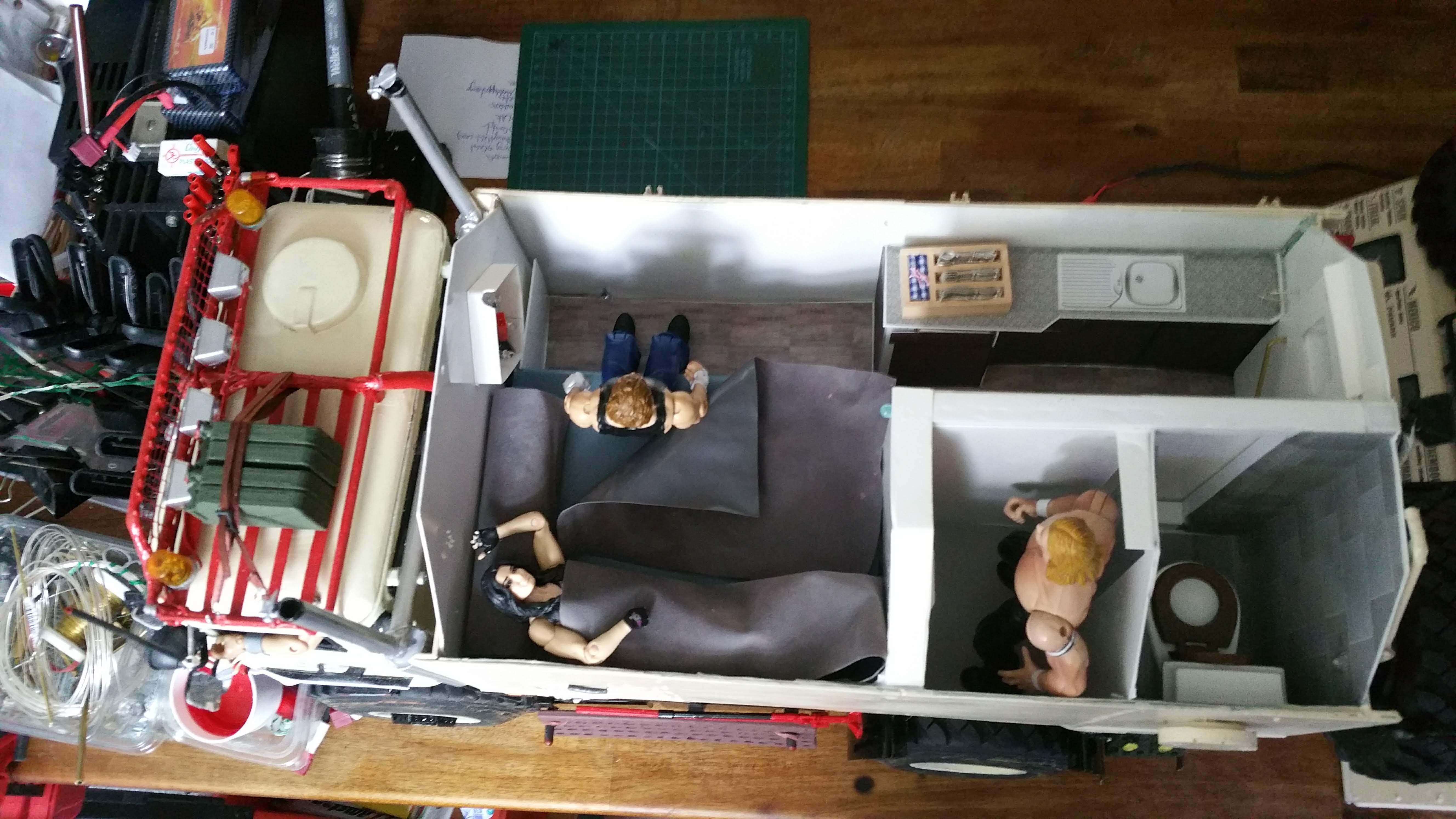 Nun soll das Fahrerhaus auf das Fahrgestell montiert werden, die Elektronik findet im Motorraum ihren Platz.
