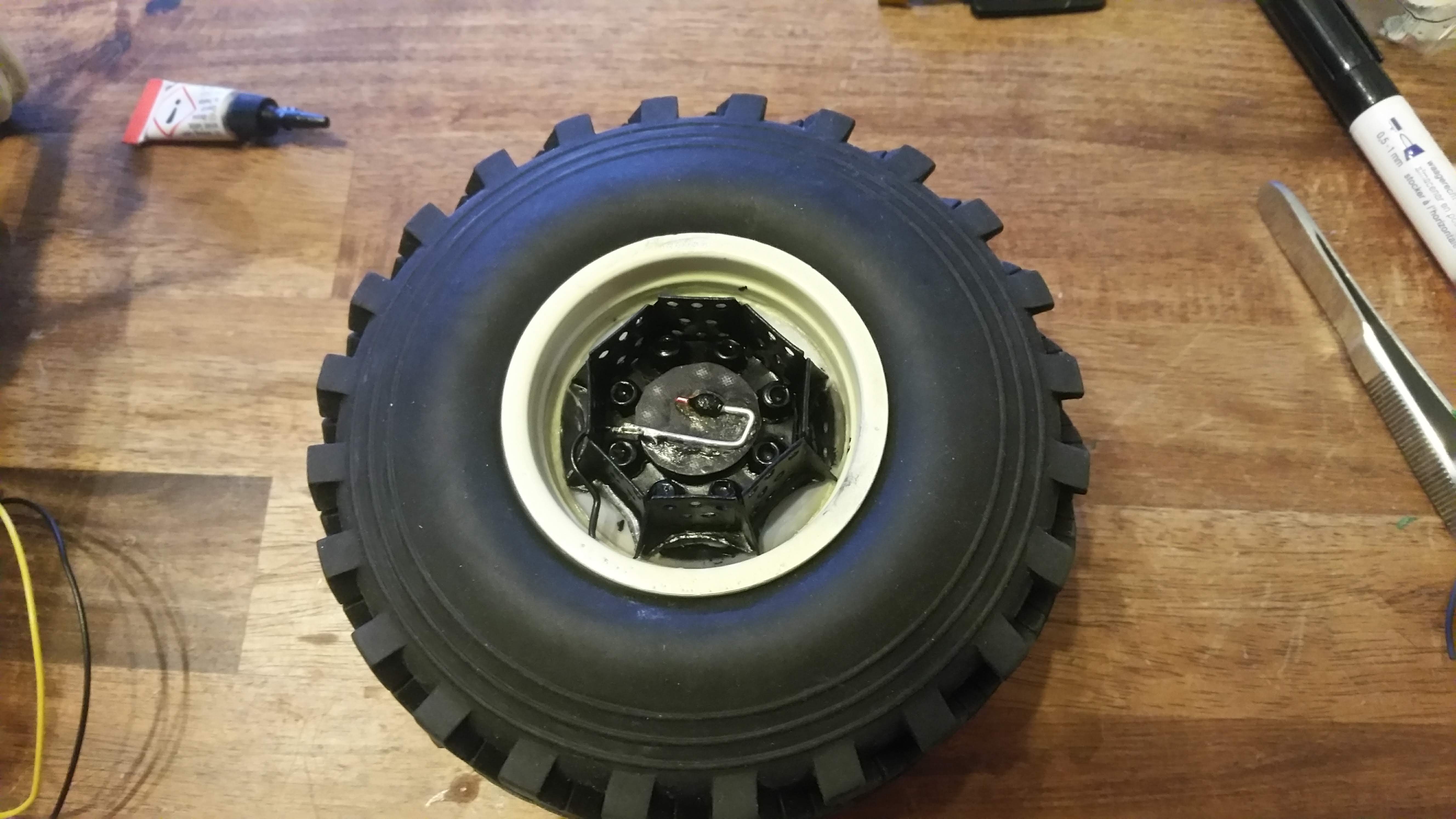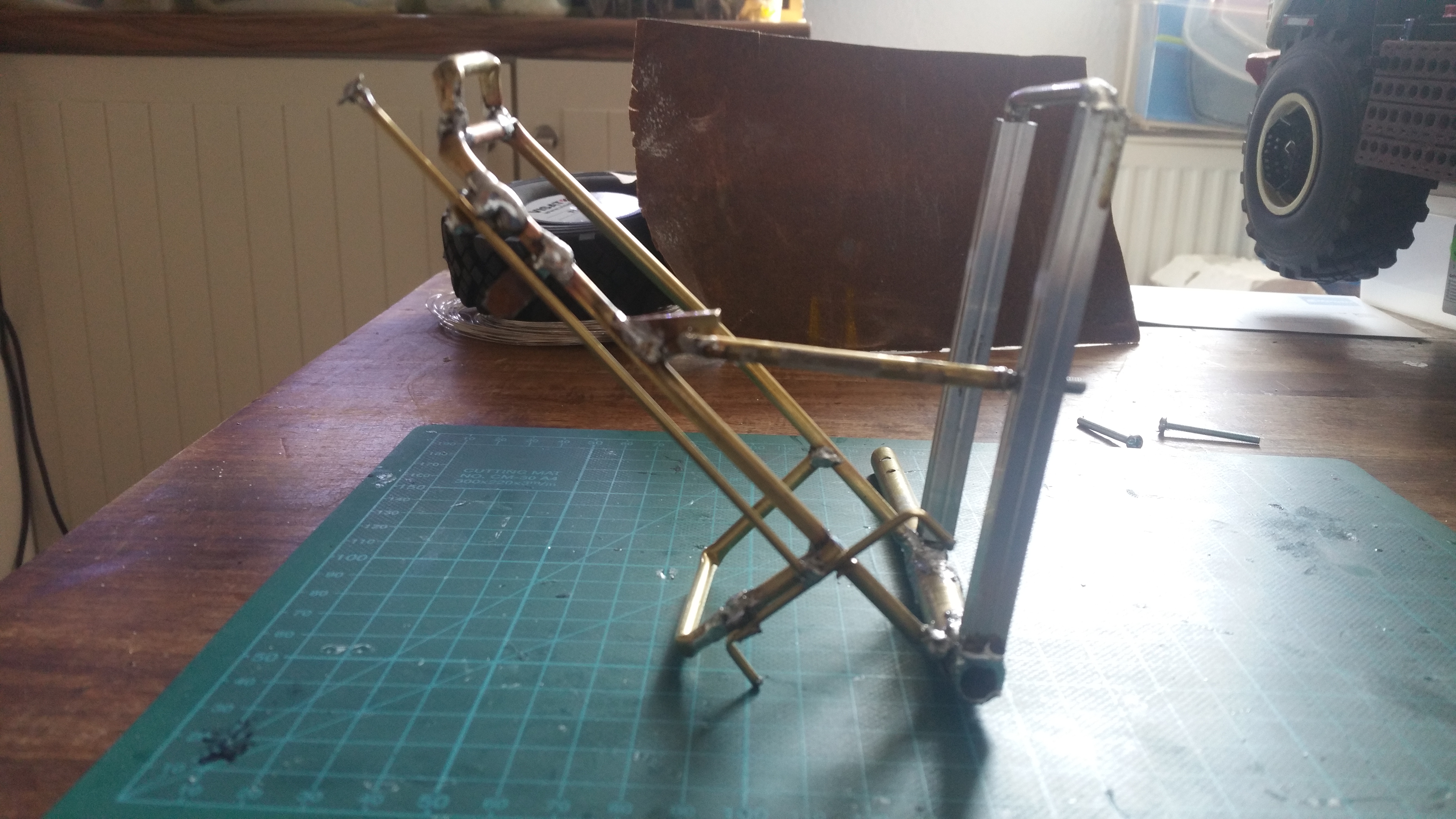Ersatzrad Halter für das Heck aus Messing und Aluminium gelötet. Der Lautsprecher kommt als Felge in den Reifen.