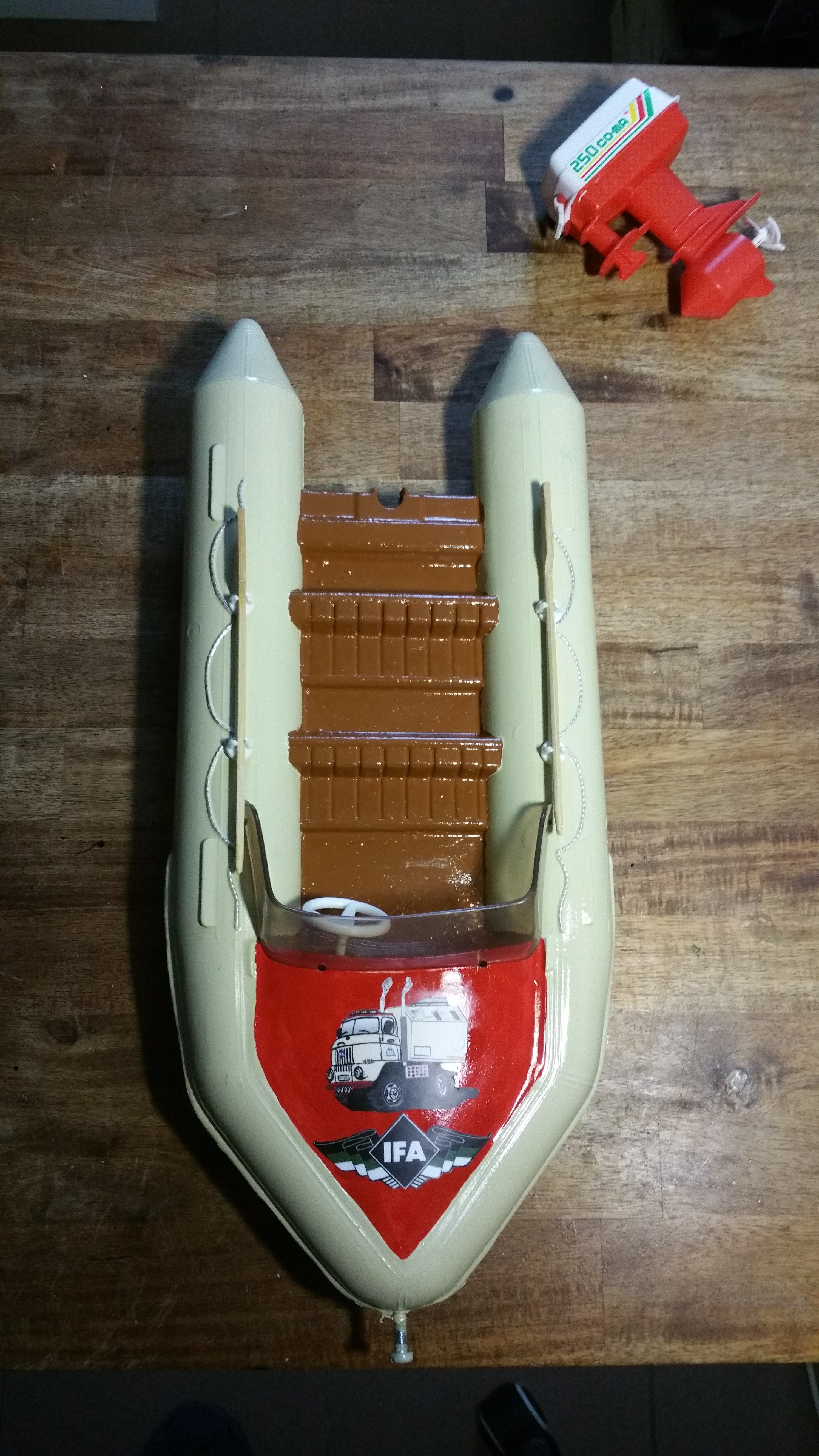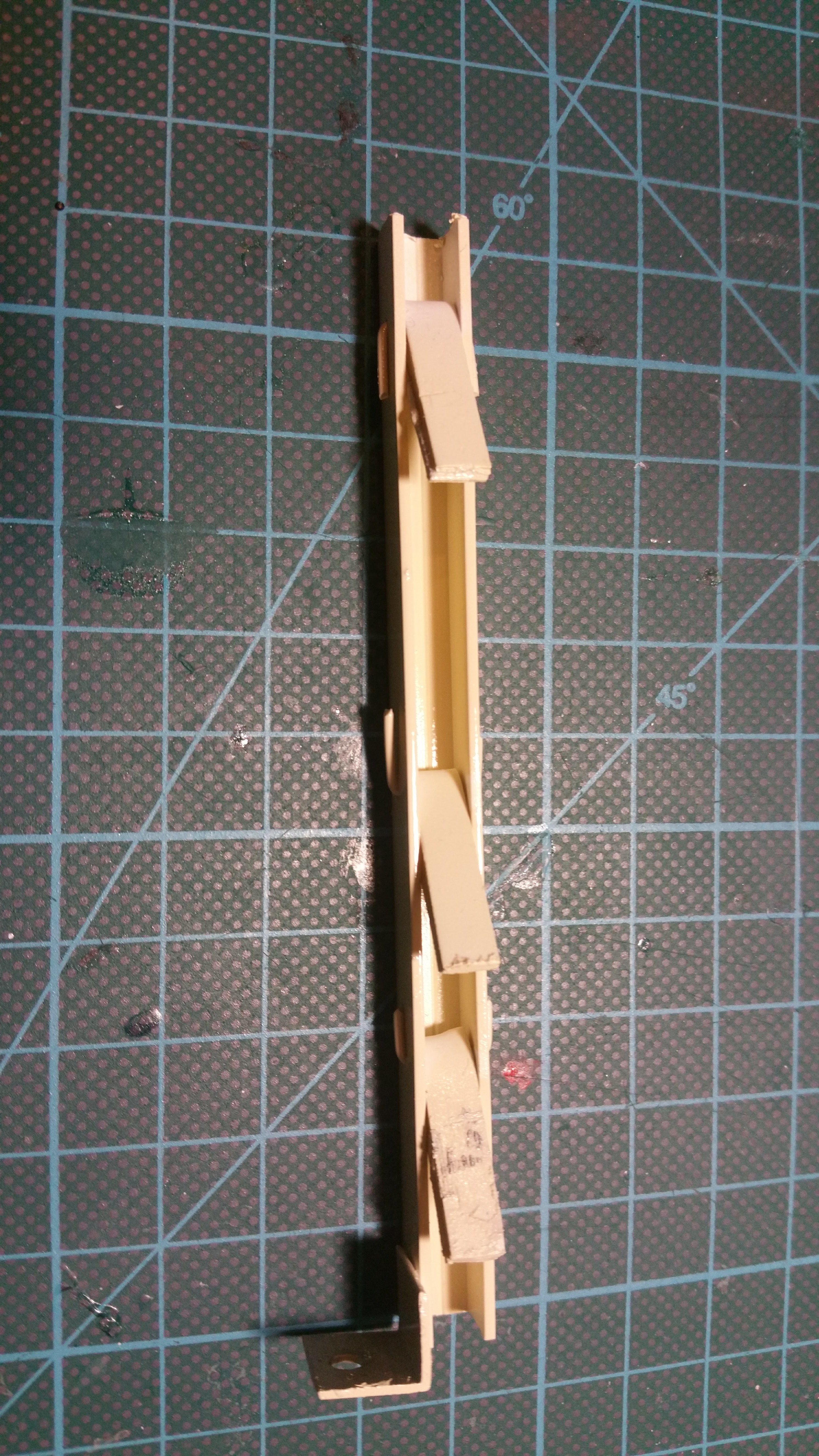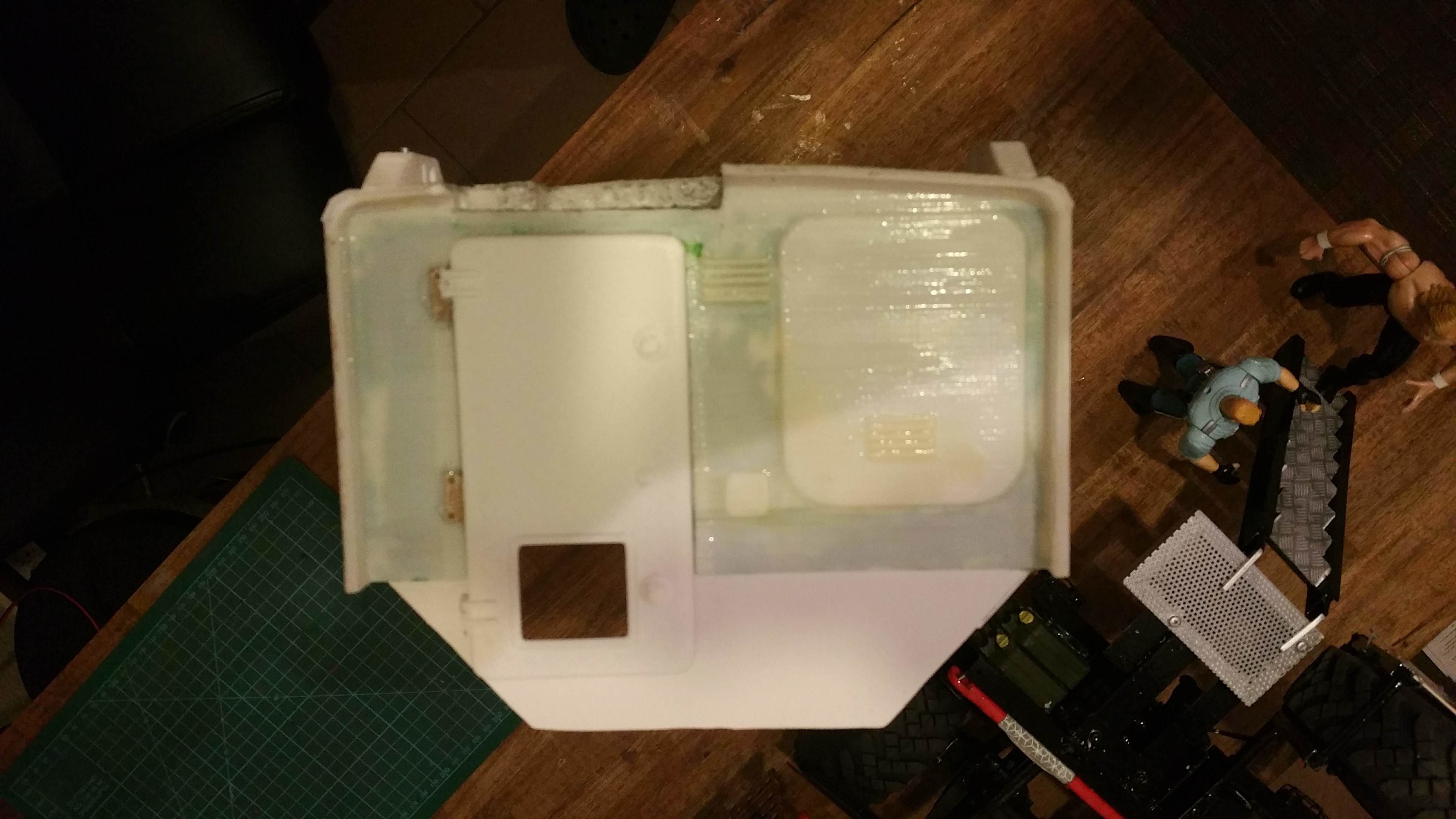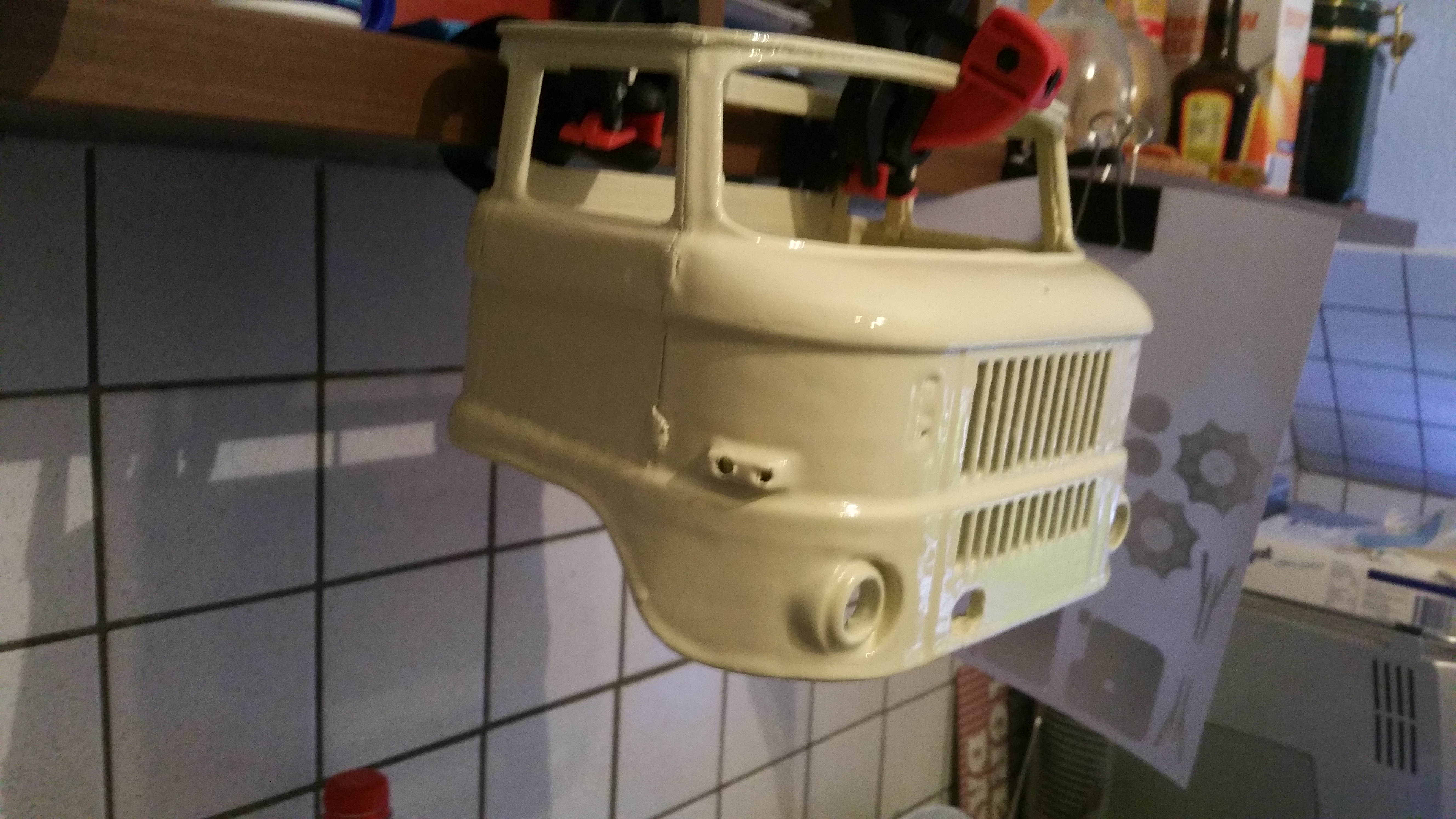 Durch ein kleines Missgeschick, ist mir das ganze Modell aus 1 Meter Höhe auf den Boden gestürzt und in viele Einzelteile zersprungen, besonders das Fahrerhaus. nach tagelanger Puzzelarbeit und Klebeorgien sieht es jetzt wieder einigermaßen nach Fahrerhaus aus. Ich habe es gleich noch mit der Spraydose lackiert.