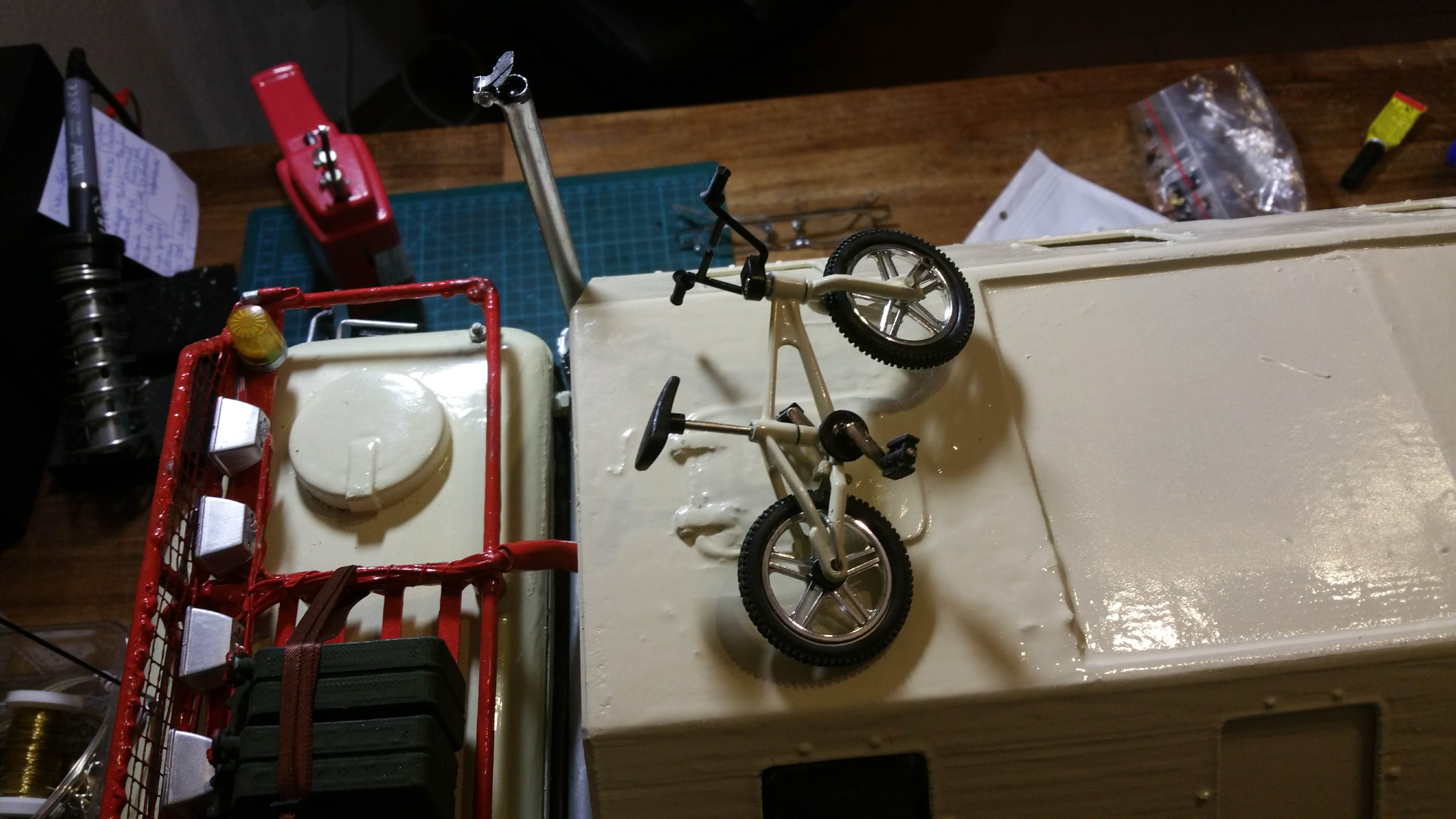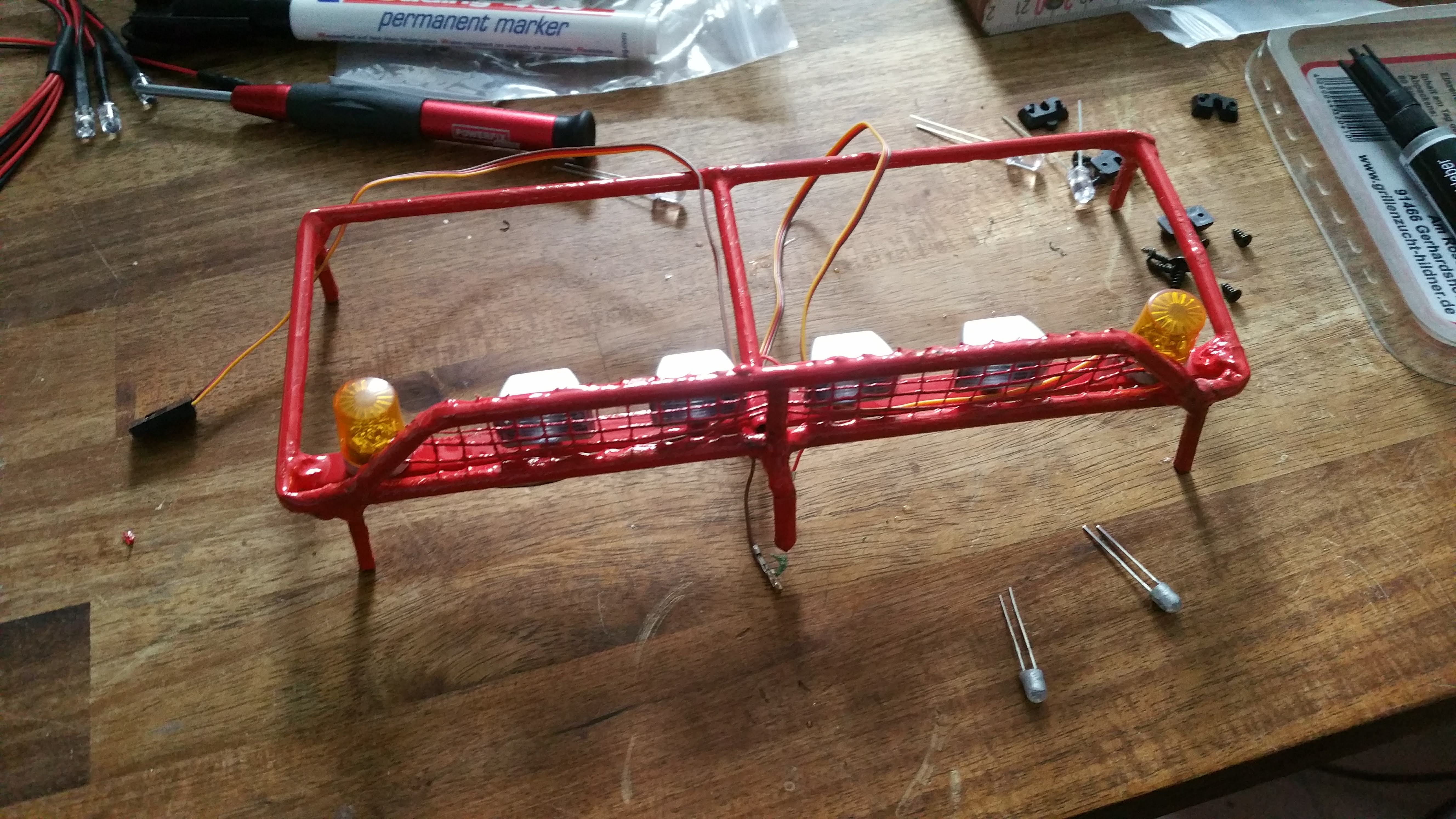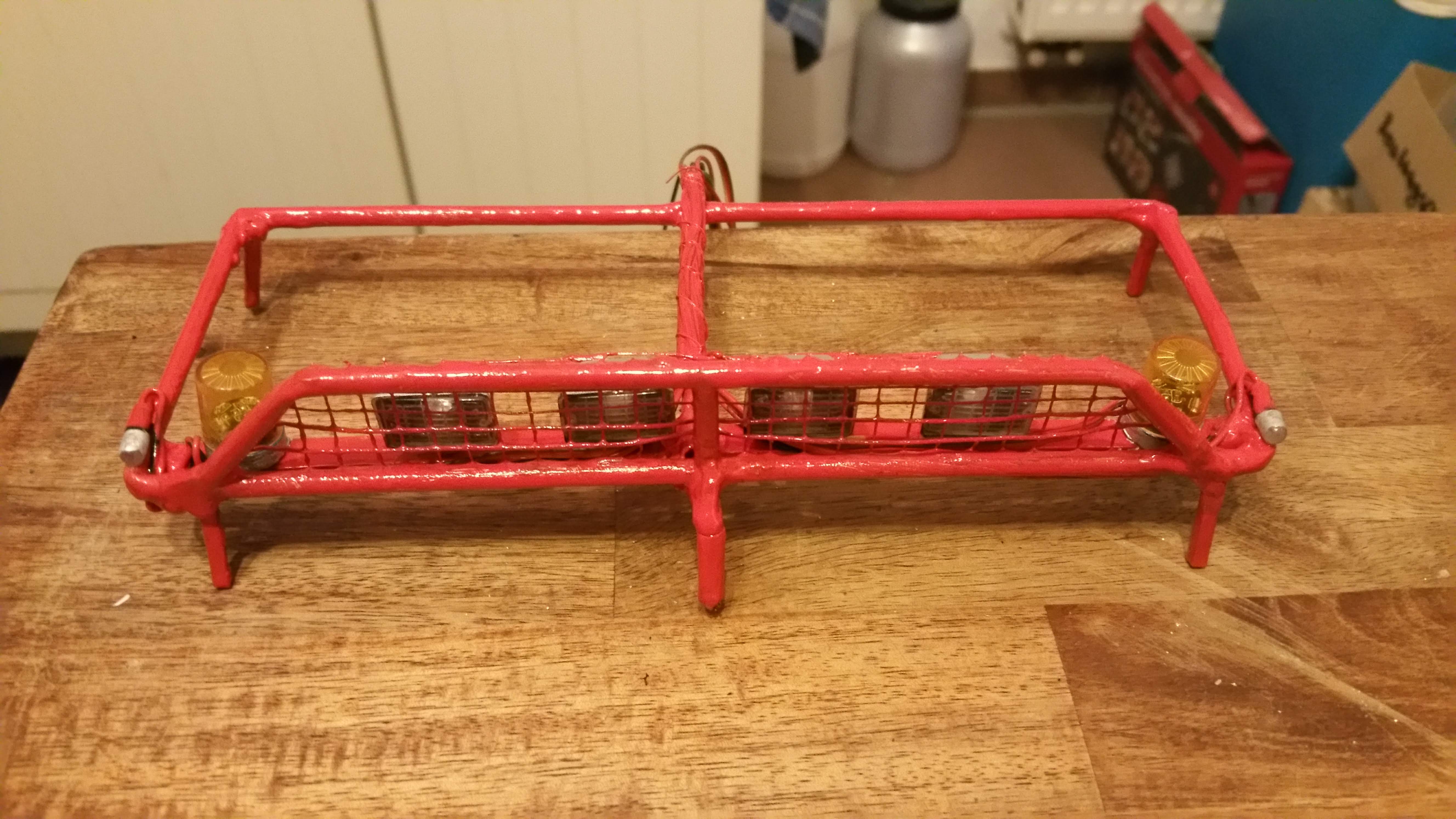 Der Dachgepäckträger wurde aus Messing gelötet und mit Scheinwerfern, Begrenzungsleuchten und Rundumleuchten versehen.