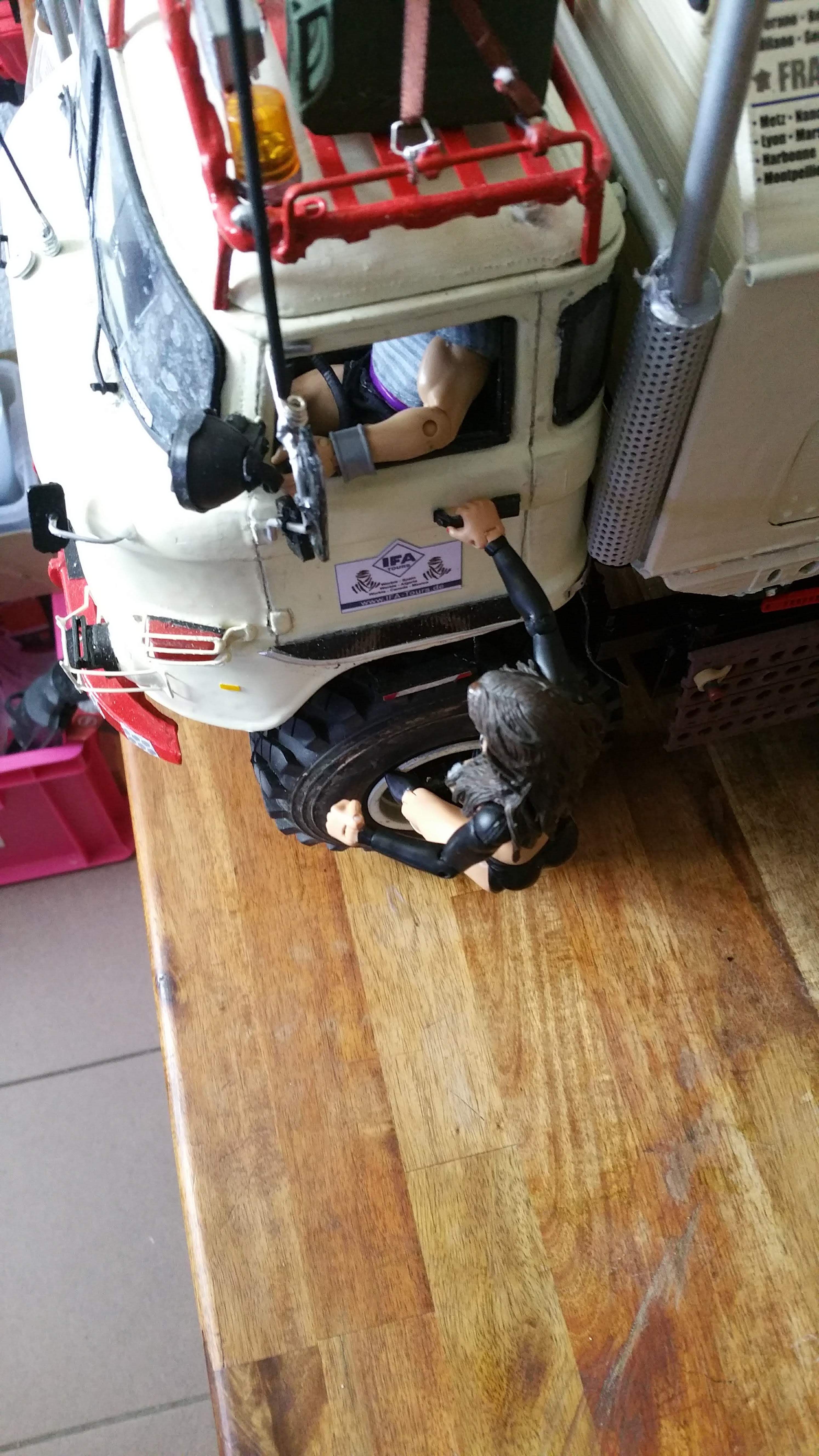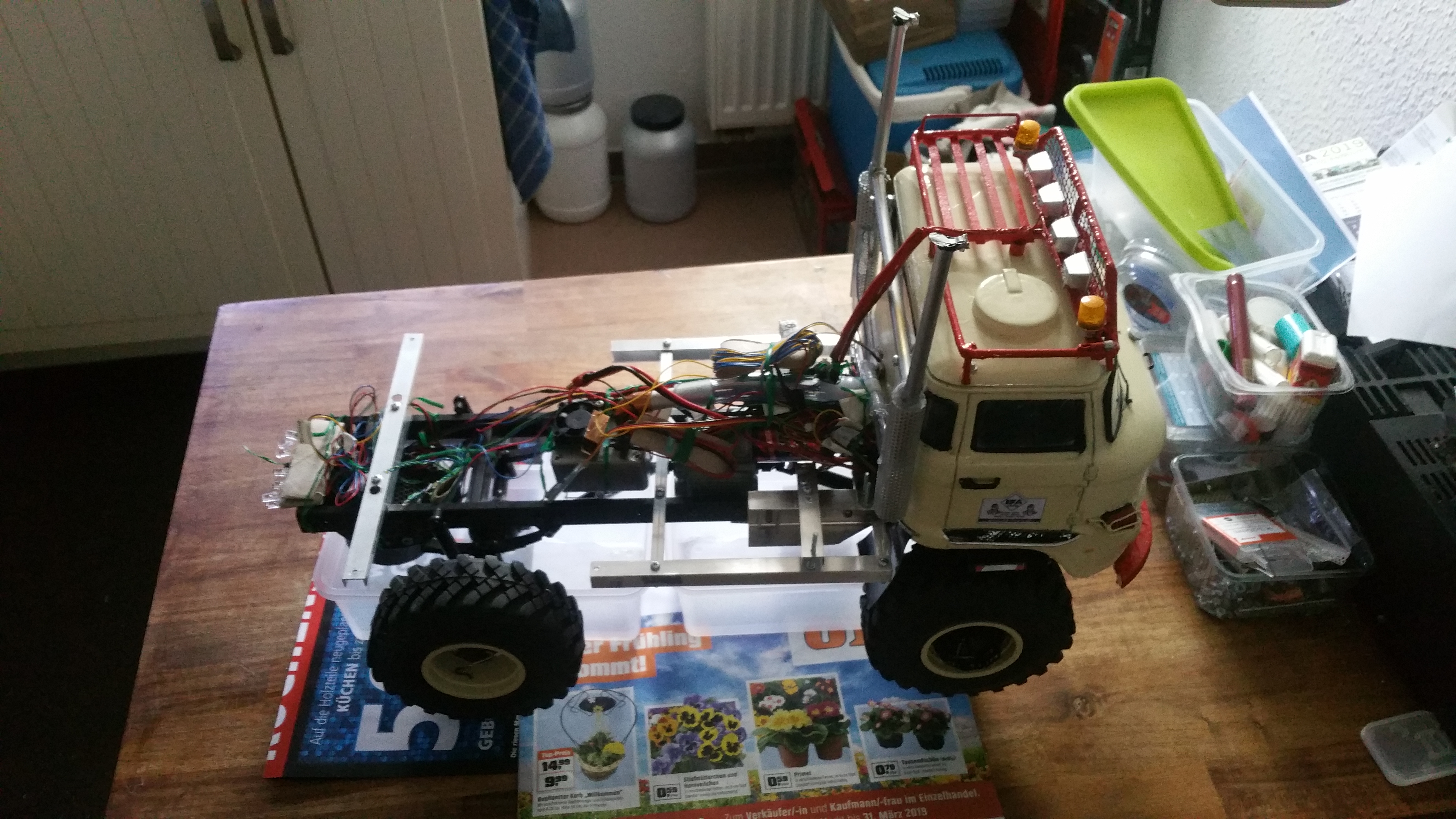 Fahrgestell und Fahrerhaus werden zusammengefügt und die Komponenten verbaut. Fahrerhaus ist kippbar montiert, das erleichtert den Zugang zur Technik (Warum hat man das nicht auch beim Original so gelöst?).