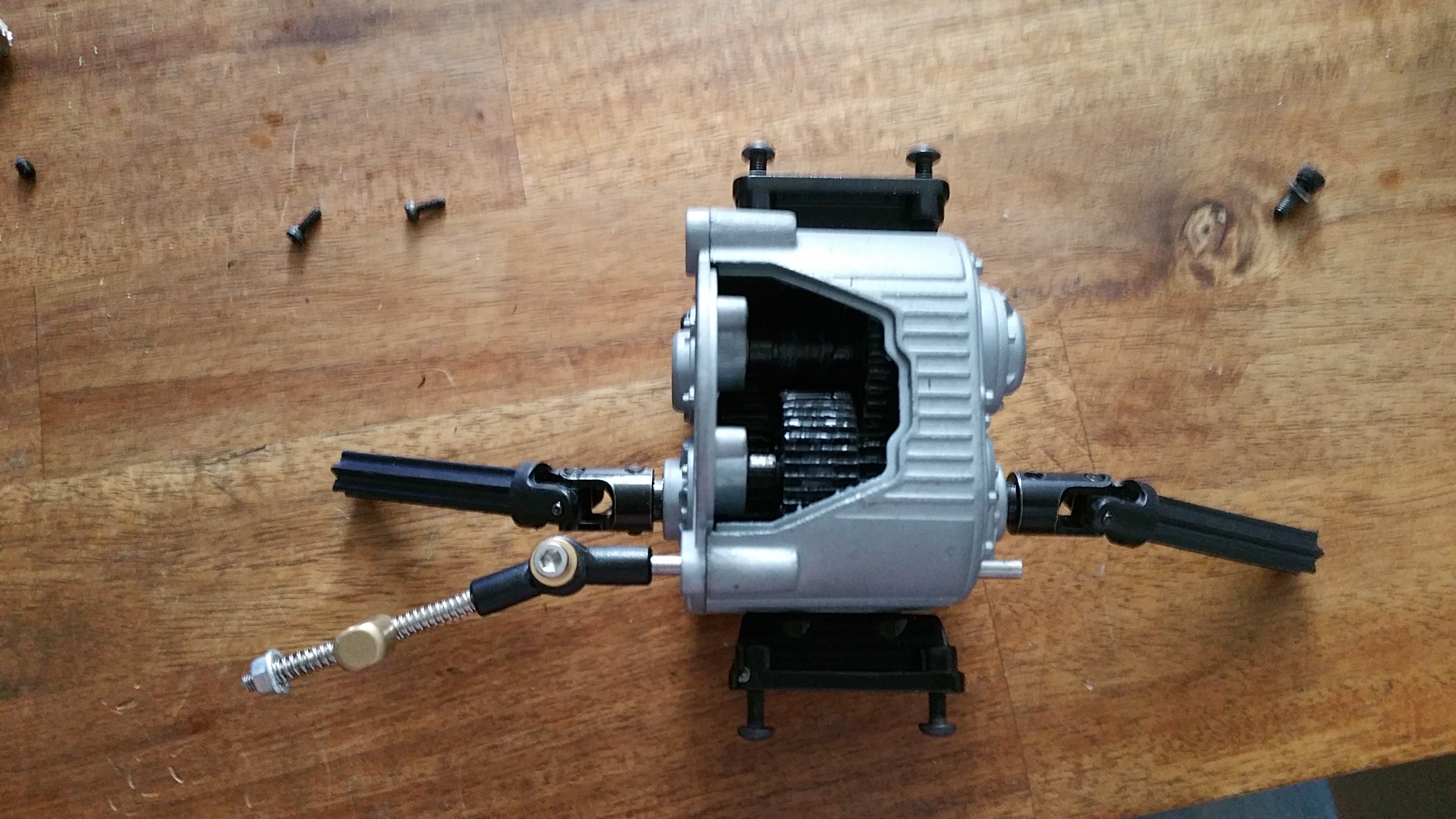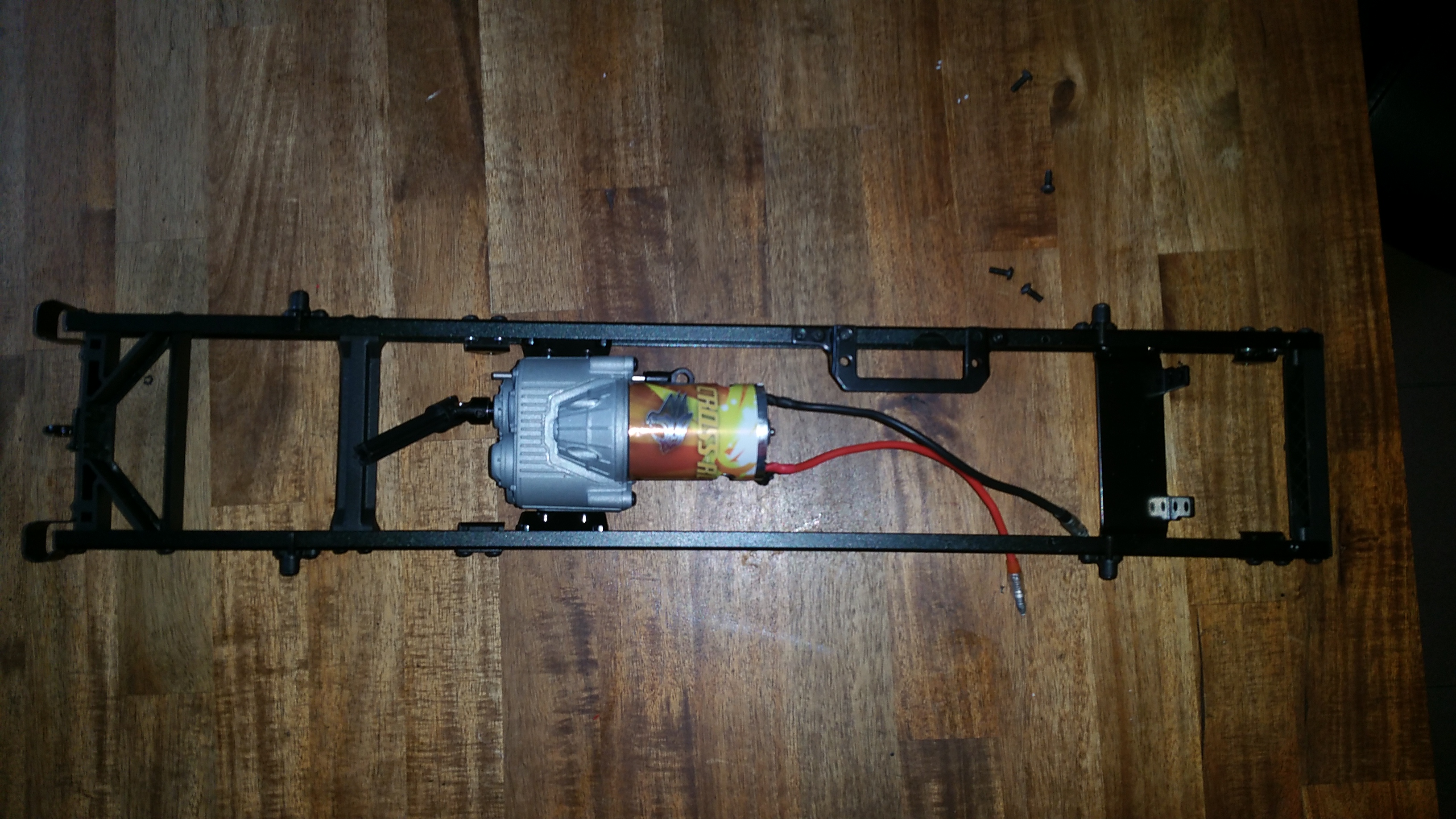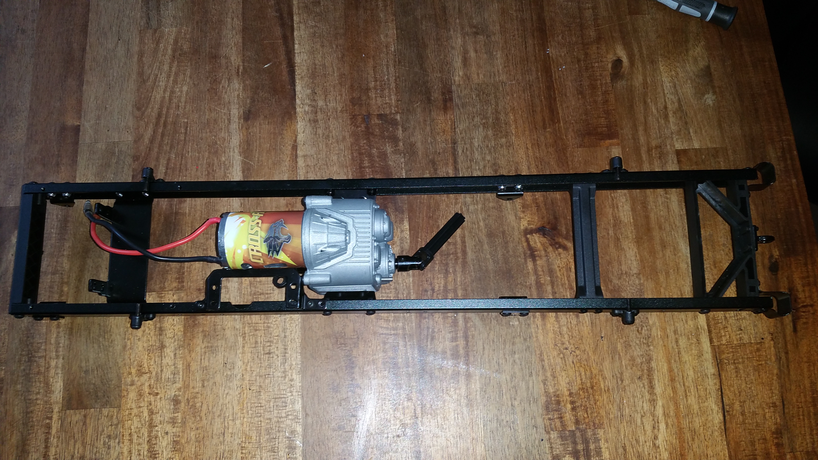 Ich habe ein Fahrgestell mit Achsen und Getriebe von einem CROSS-RC Truck GC4 4x4 gefunden welches meinen Vorstellungen sehr nahe kommt. Die Basis für das Fahrzeug ist somit schon mal vorhanden. Einen Motor bekam ich auch gleich mit, der wird aber noch ersetzt gegen ein anderes Modell. Den Rahmen habe ich montiert und auch den vorhanden Motor eingebaut