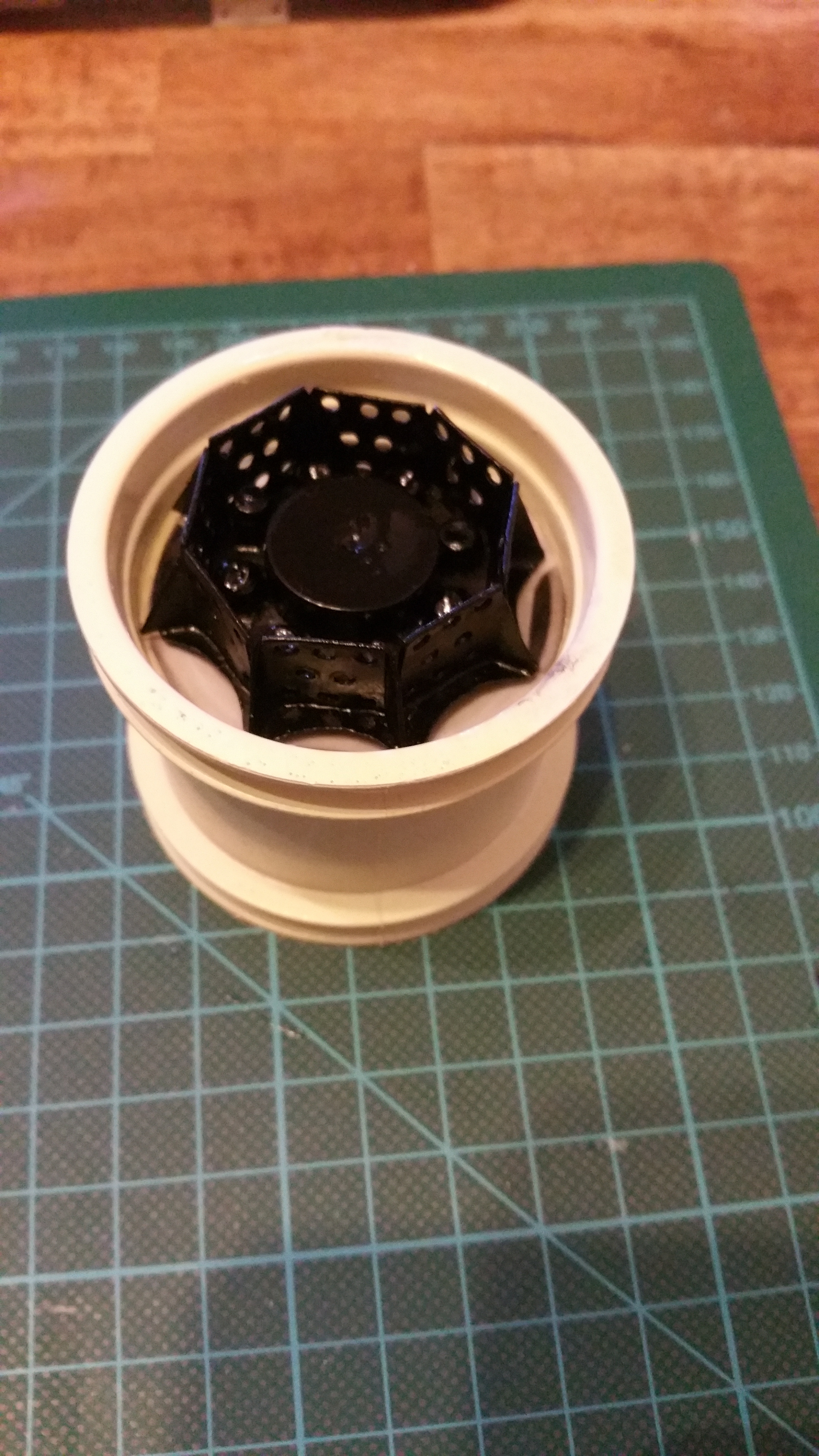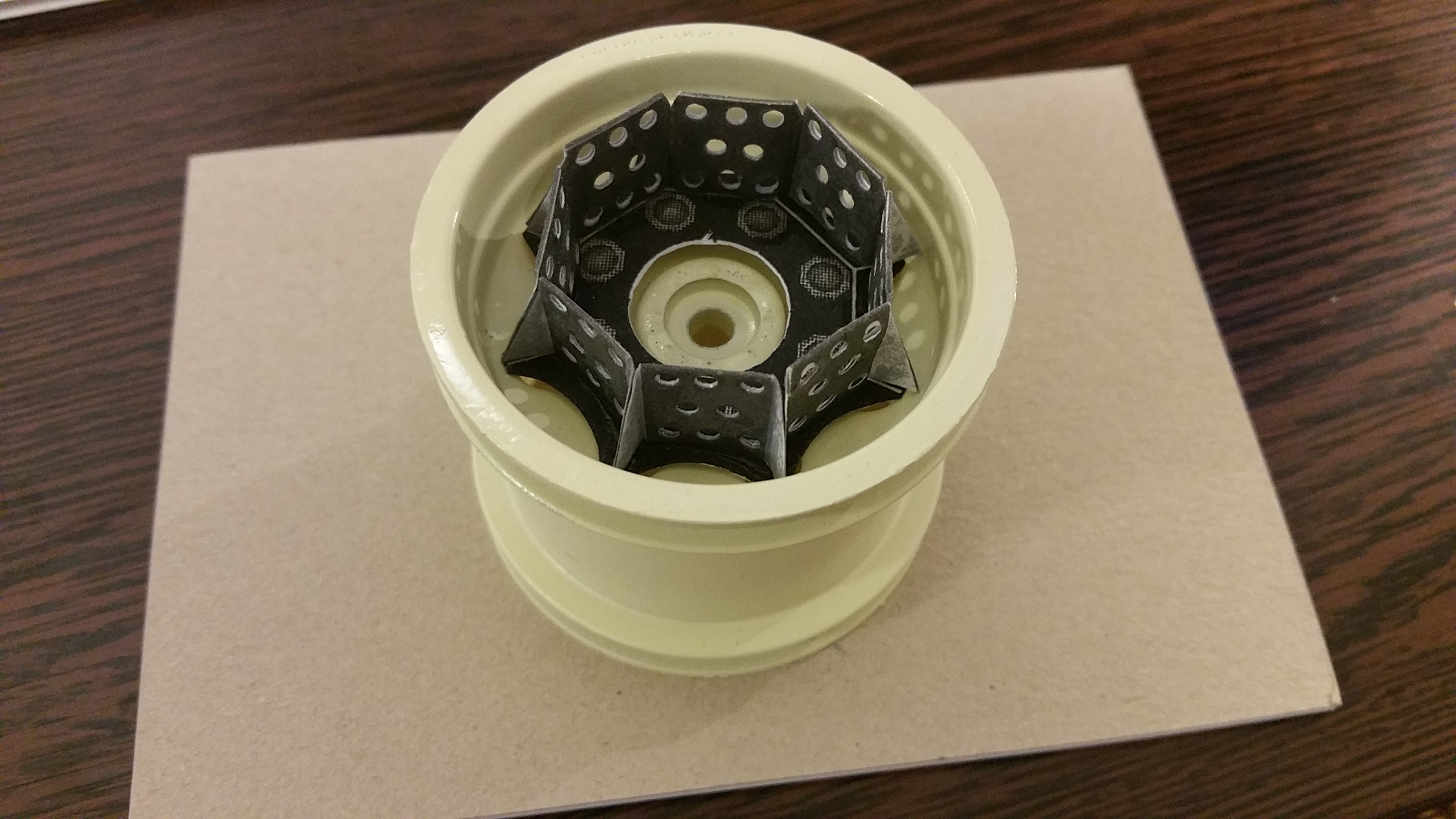 Nebenbei werden immer noch andere Baugruppen und Details bearbeitet. Hier die Radkränze, hergestellt aus Papier und mit flüssigen Kunststoff gehärtet.