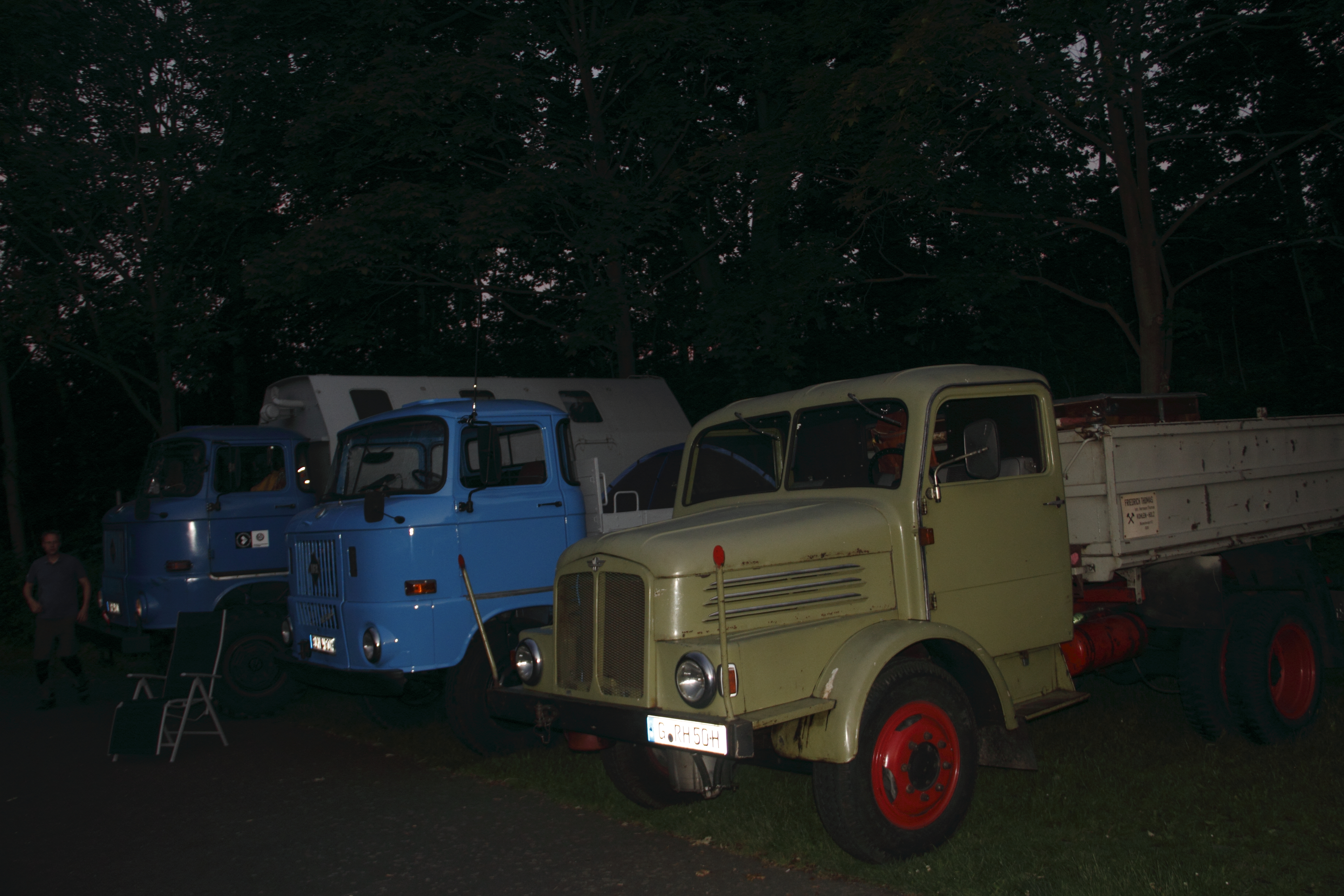 Bis hier hin waren es ca. 480 Kilometer von Nordhausen mit ca. 10 IFA Lkw im Konvoi. Unterwegs schlossen sich immer wieder weitere IFA-Fahrzeugen an und begleiteten den Konvoi ein Stück des Weges. Im IFA-Tours Camp wurde noch eine kleinere Reparatur an einem Fahrzeug durchgeführt. Ein Kompressor hatte sich gelockert und musste wieder befestigt werden. Dank tatkräftiger Hilfe der Teilnehmer, war diese kleine Reparatur schnell erledigt.