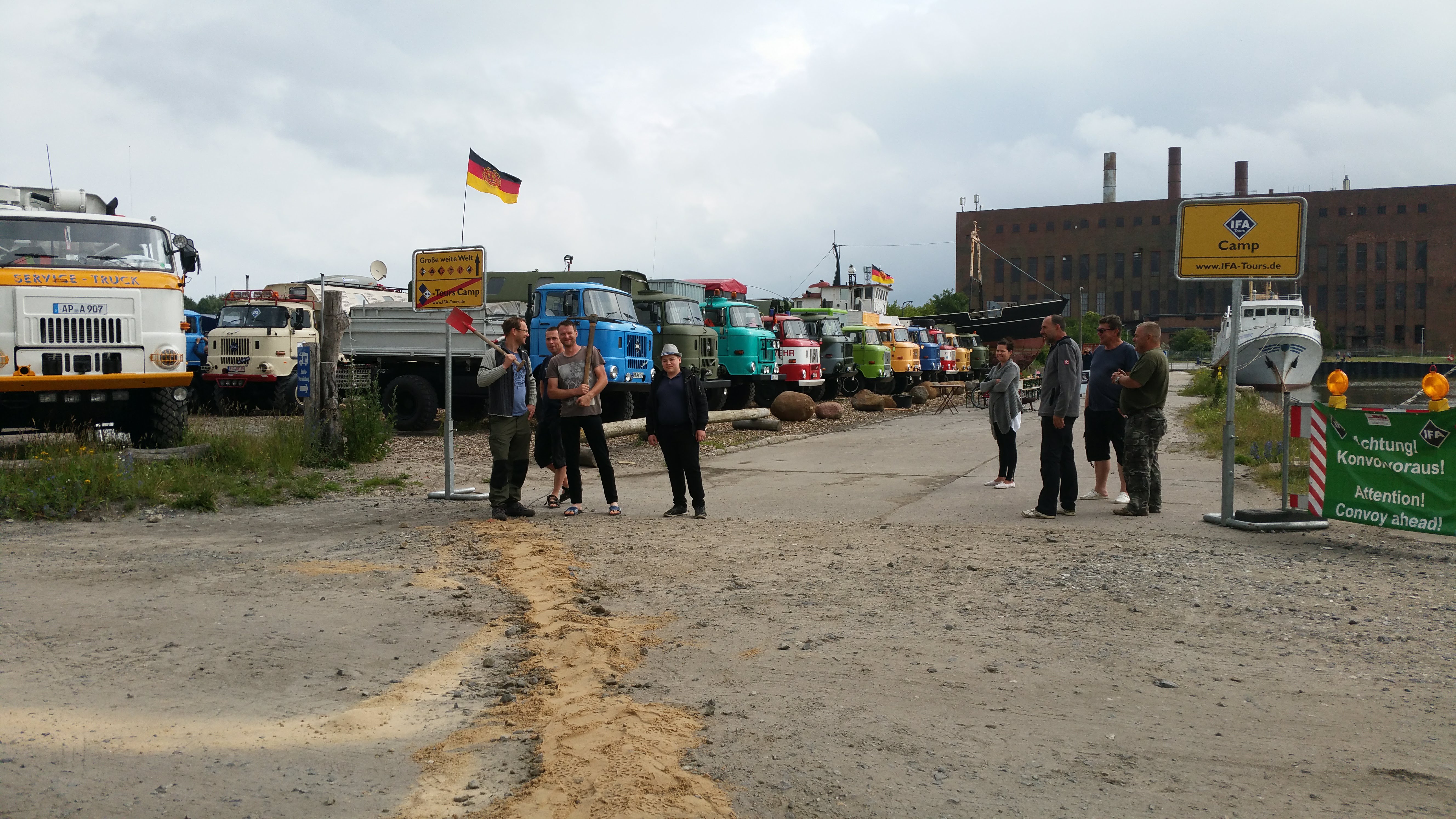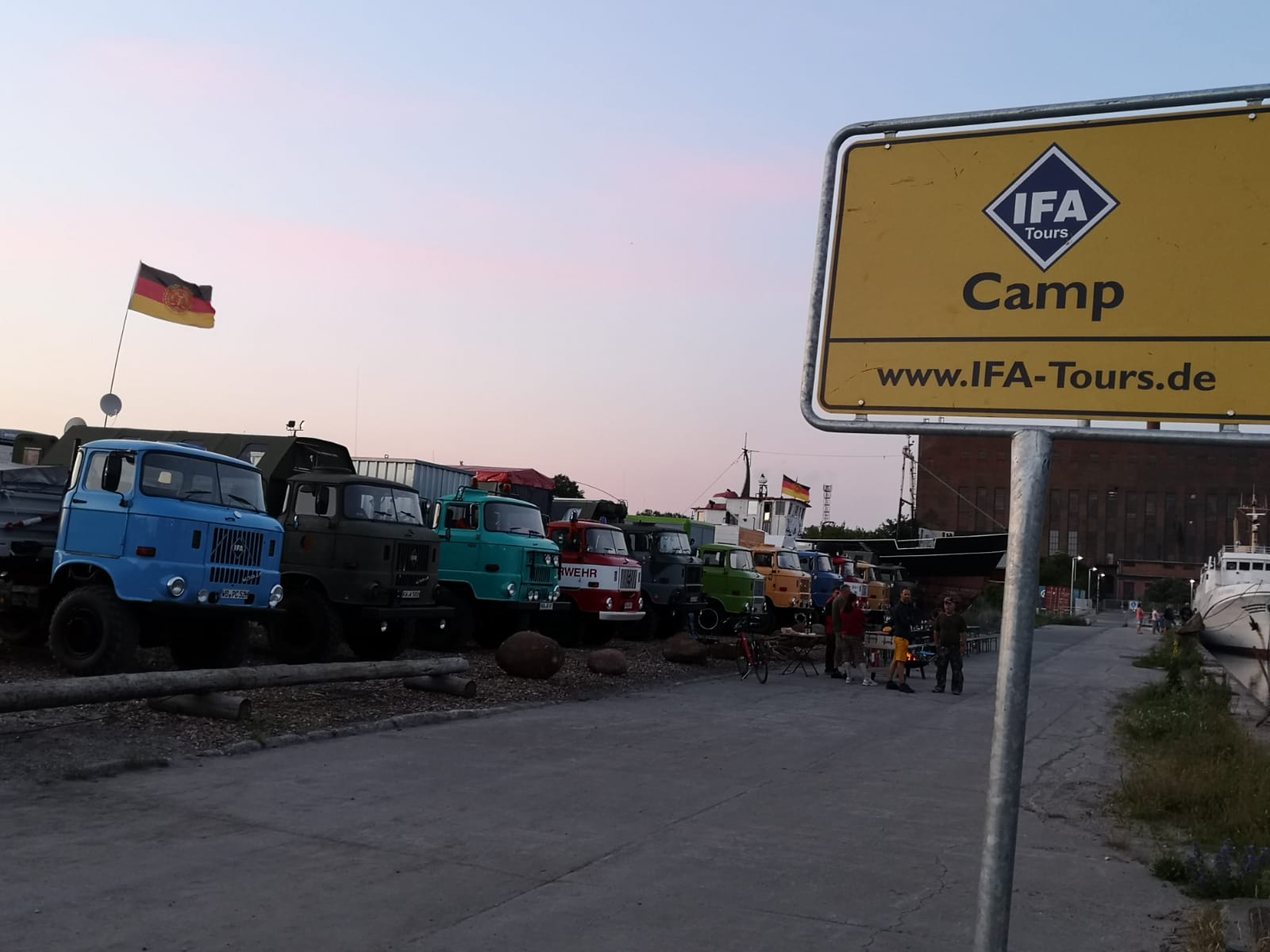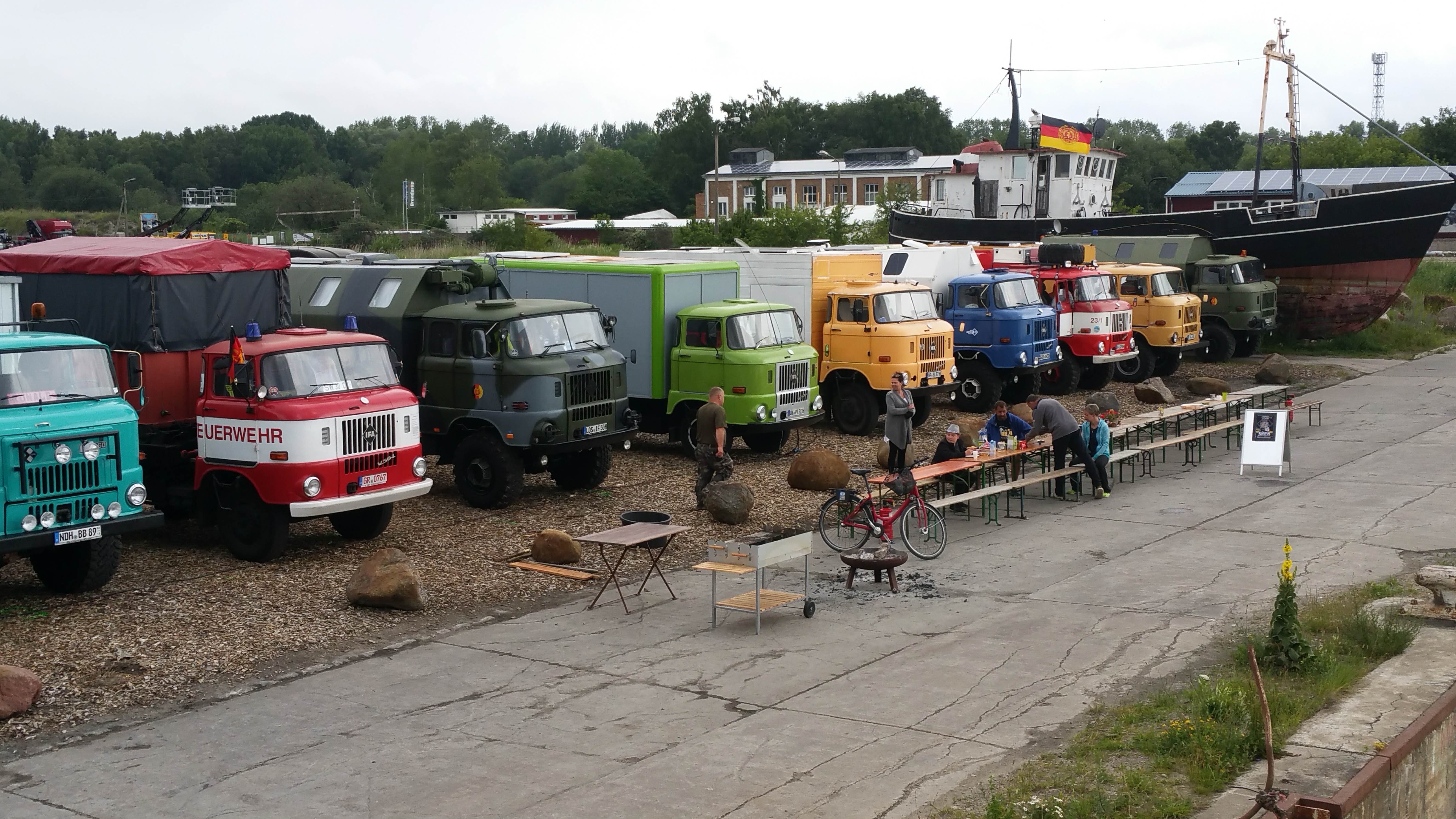 Am späten Nachmittag war es dann geschafft und das Ziel Peenemünde Hafen erreicht. Auf dem Hafengelände warteten schon die Organisatoren und weitere Teilnehmer mit ihren LKW auf uns. Das IFA-Tours Camp wurde direkt an der Hafenmauer bezogen, mit Blick auf die Ostsee und direkt vor dem Camp lag das Raketenschiff "Hans Beimler" vor Anker. Hiermit war der letzte Punkt der langen Reise erreicht und der Konvoifahrt war hier zu Ende und das 23. IFA-Tours Treffen in Peenemünde begann.