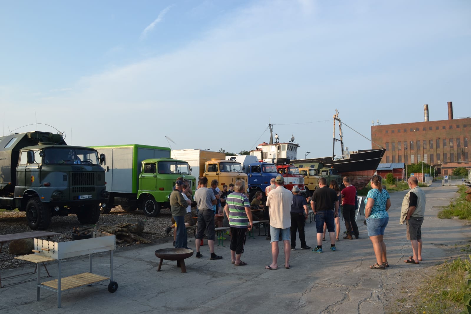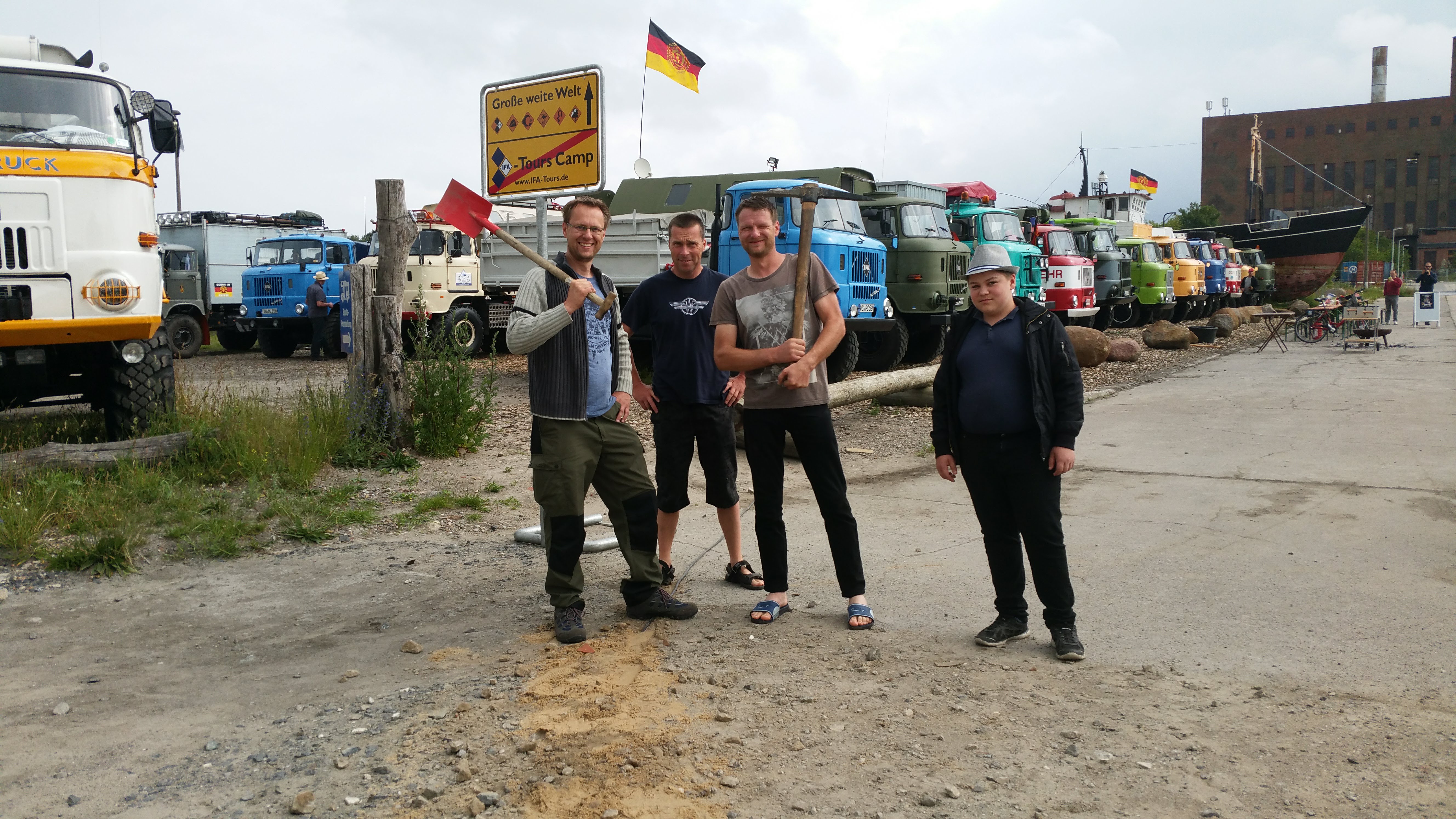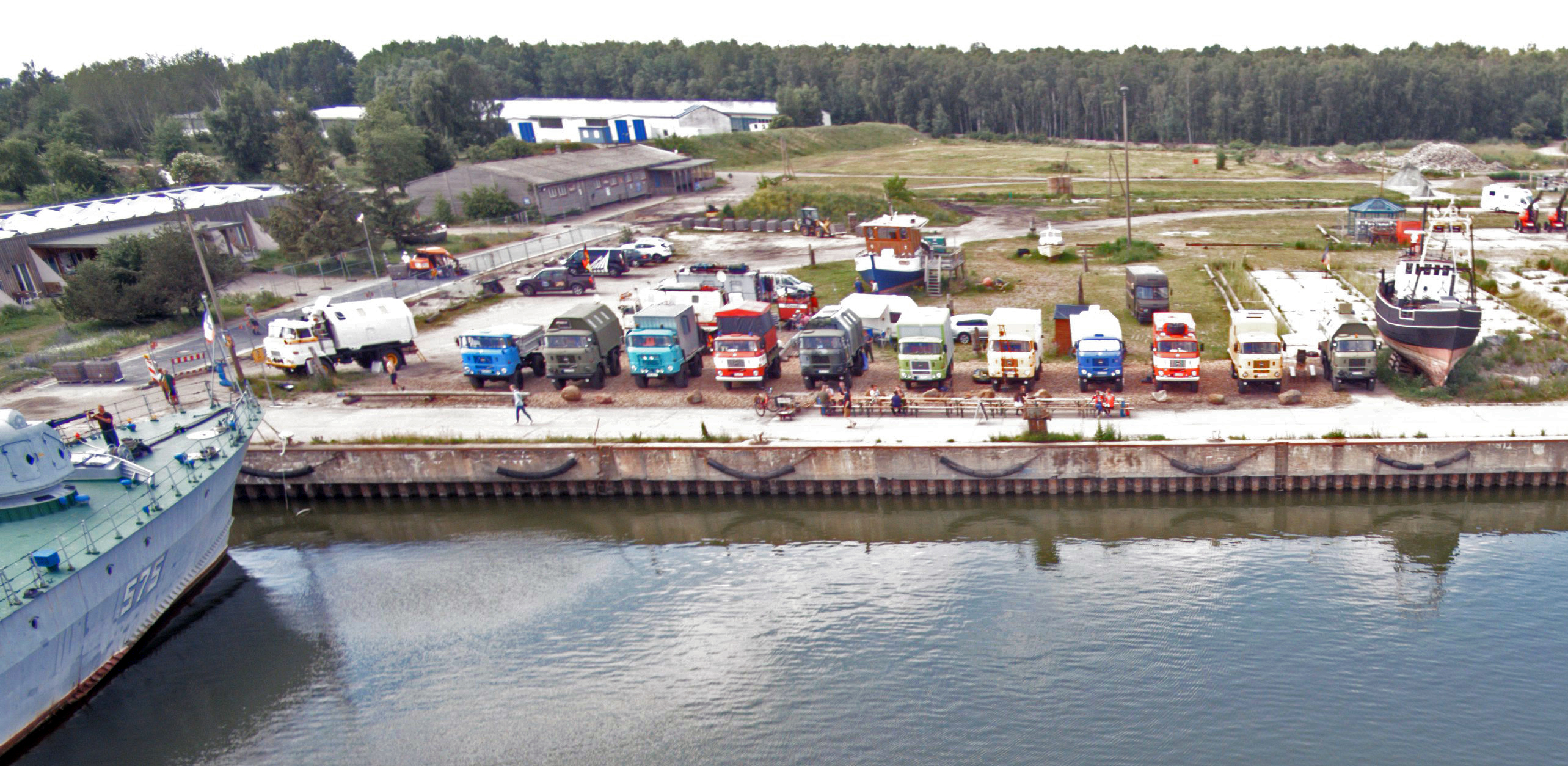 Am späten Nachmittag war es dann geschafft und das Ziel Peenemünde Hafen erreicht. Auf dem Hafengelände warteten schon die Organisatoren und weitere Teilnehmer mit ihren LKW auf uns. Das IFA-Tours Camp wurde direkt an der Hafenmauer bezogen, mit Blick auf die Ostsee und direkt vor dem Camp lag das Raketenschiff "Hans Beimler" vor Anker. Hiermit war der letzte Punkt der langen Reise erreicht und der Konvoifahrt war hier zu Ende und das 23. IFA-Tours Treffen in Peenemünde begann.