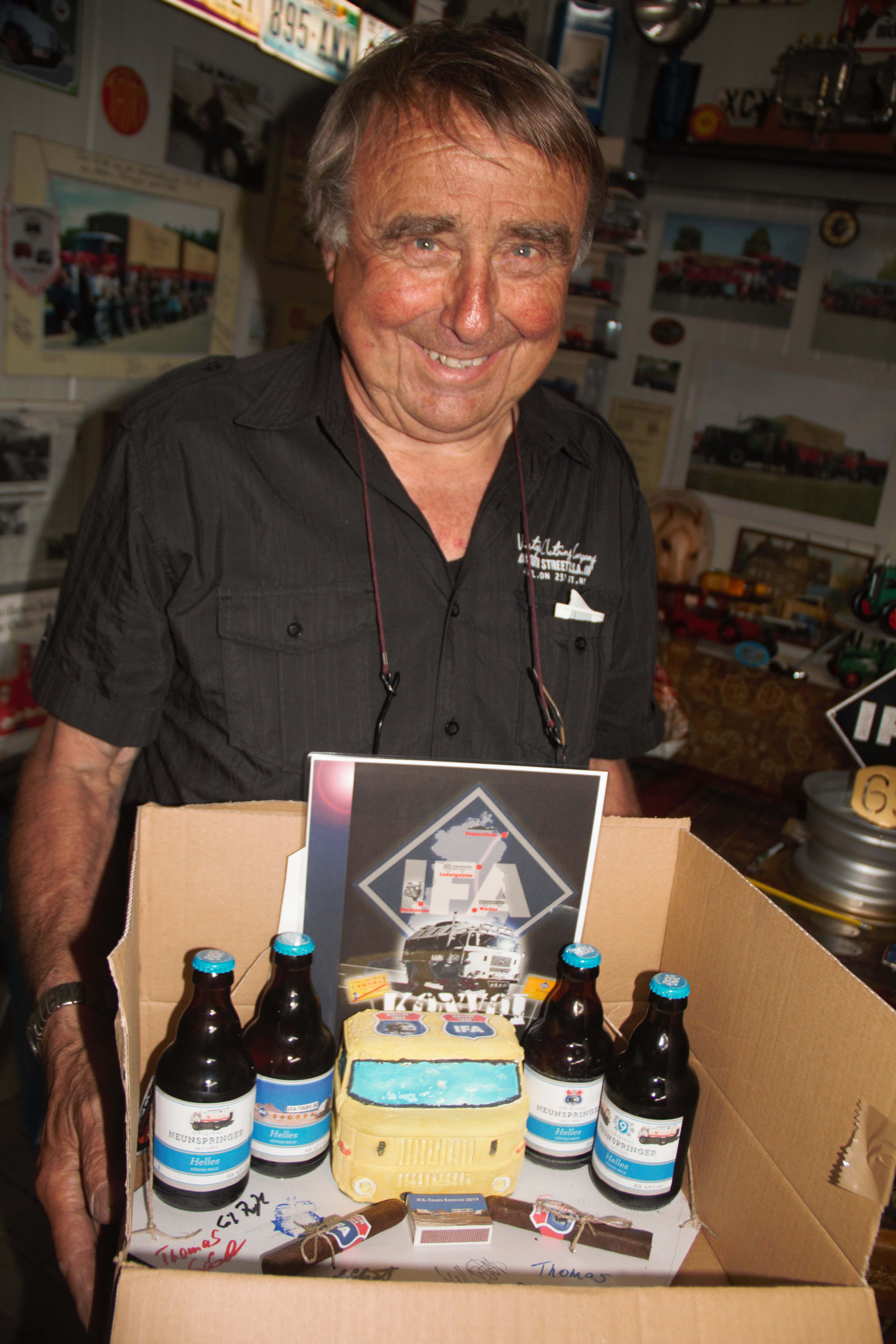 Es wurde viel gestaunt und gefachsimpelt, die Zeit verging wie im Fluge. Zum Abschluss wurde noch ein kleines Geschenk von IFA-Tours an Herrn Poller überreicht. Ein Geschenk, welches mit einem IFA LKW W50 Fahrerhaus, IFA-Tours Bier und IFA-Tours Zigarren den Konvoi symbolisieren sollte.